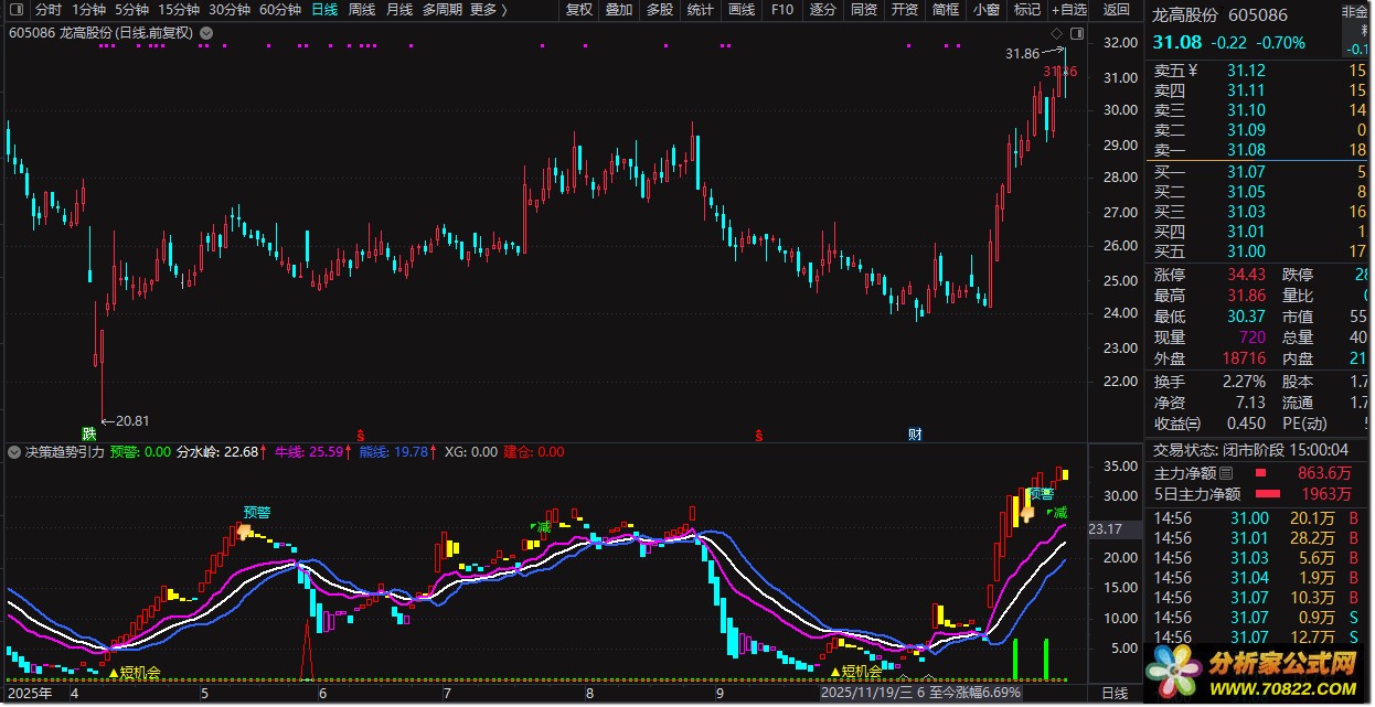 > 使用建议:本指标适用于日线/60分钟级别交易,建议配合成交量验证信号强度。在震荡市中关注分水岭附近的多空转换,趋势行情中沿牛熊线方向操作。