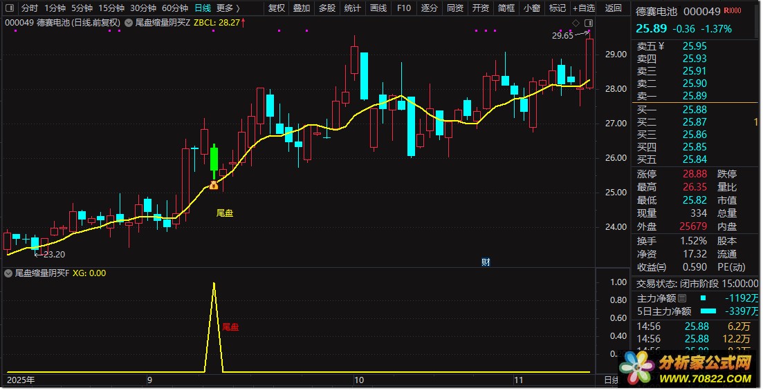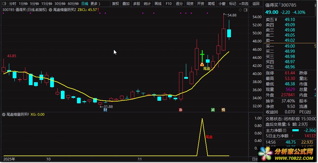【尾盘缩量阴买】擒牛买入策略,上升趋势回调低吸技巧 指标包含:1个主指标、1个副指标及1个选股公式,本指标仅供交流参考学习之用!