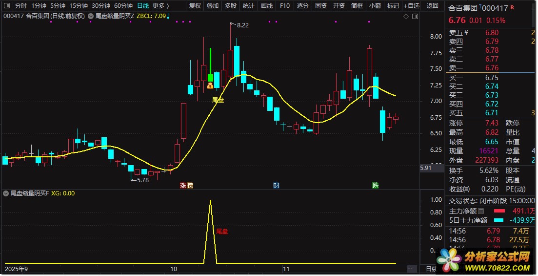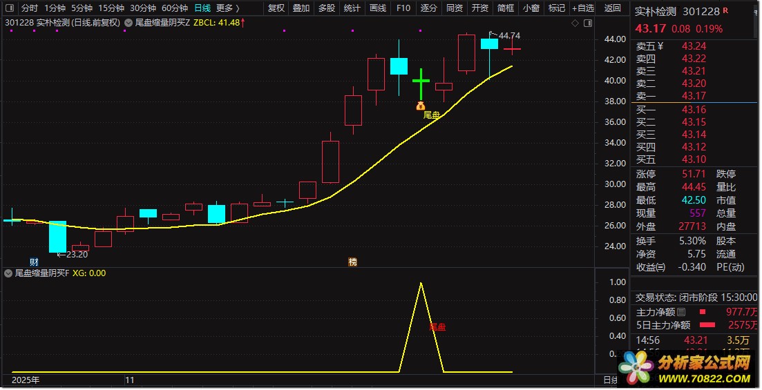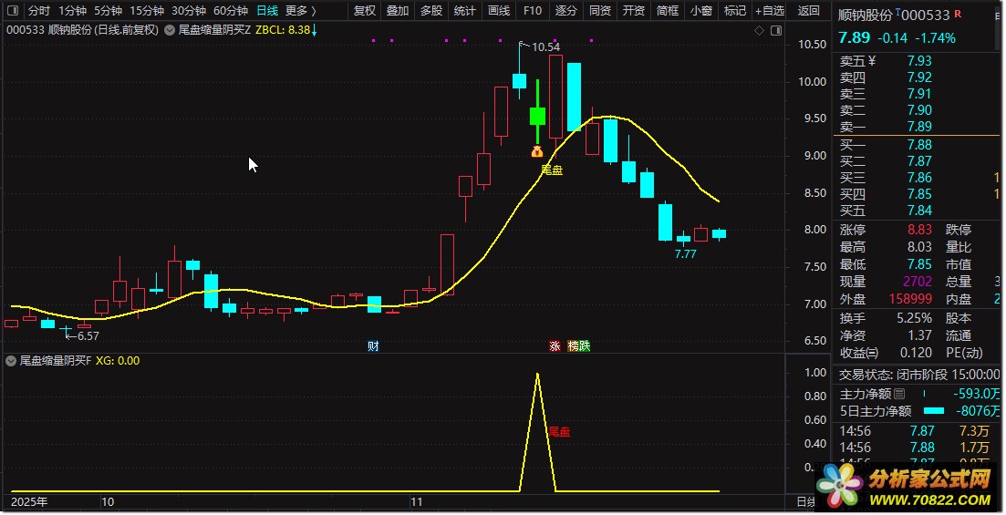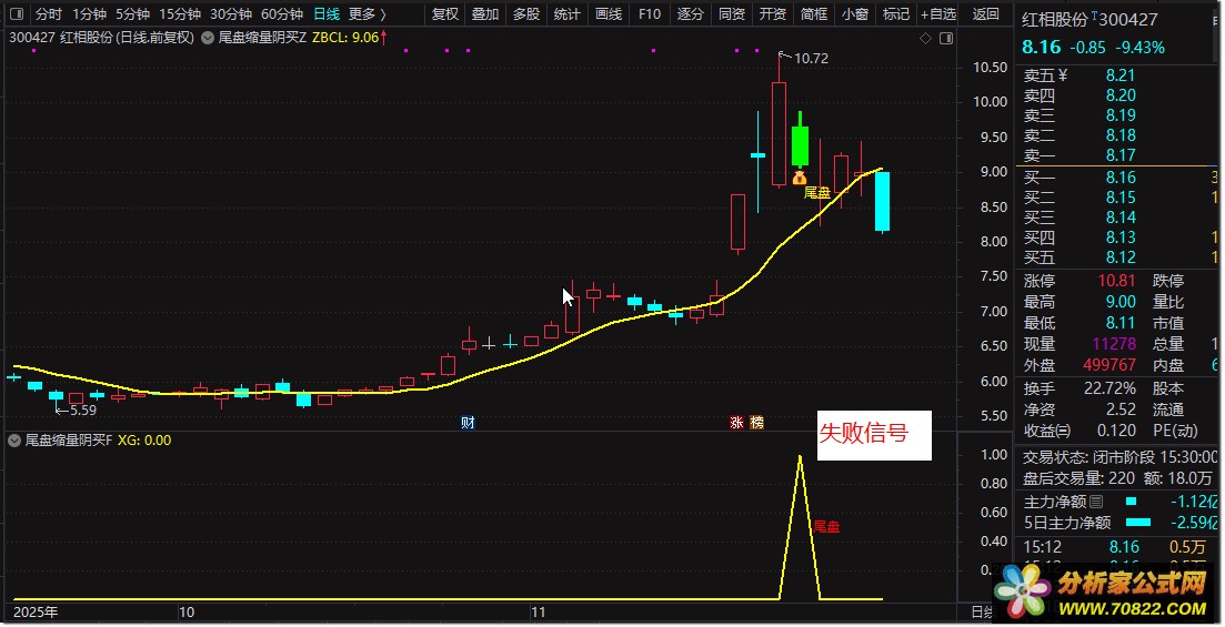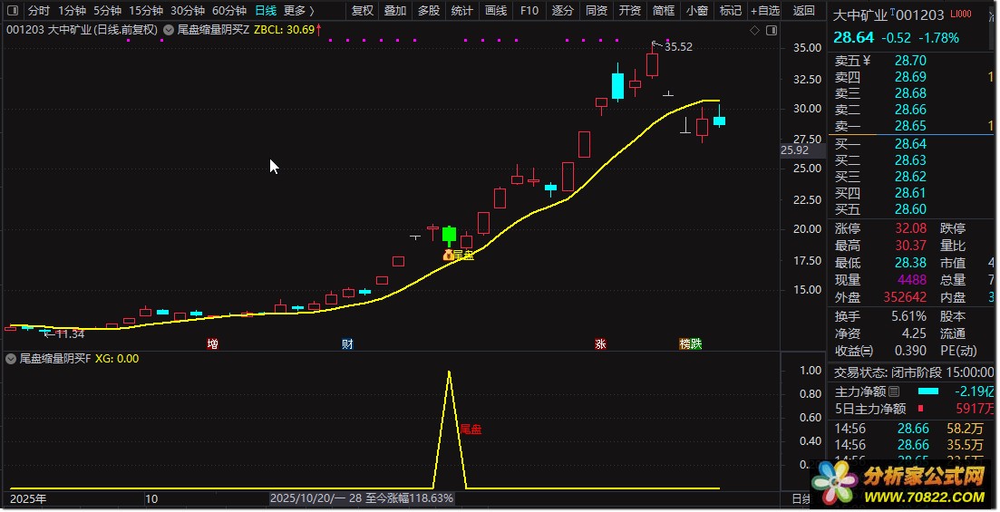在上升趋势行情中,运用尾盘缩量阴买擒牛买入策略的核心逻辑在于:当股价处于上升趋势时,尾盘出现的缩量阴线往往更可能是主力短期洗盘行为(而非趋势反转信号)。缩量特征显示抛压相对有限,后续股价大概率延续原有上升趋势。由于是尾盘买入,当天交易风险较低,缩量阴线意味着抛压小,此时低吸买入风险可控。