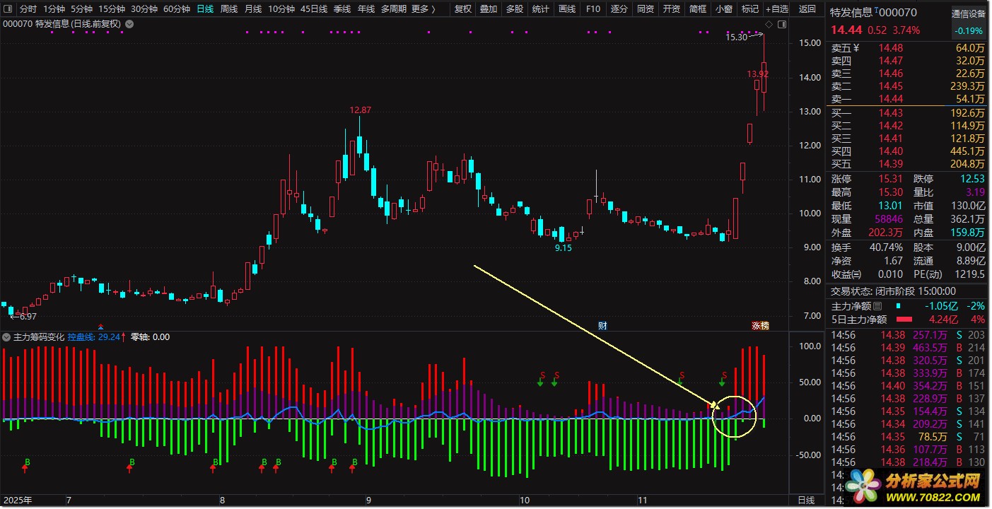 紫线突然放大,筹码快速集中,可能进入拉升阶段。