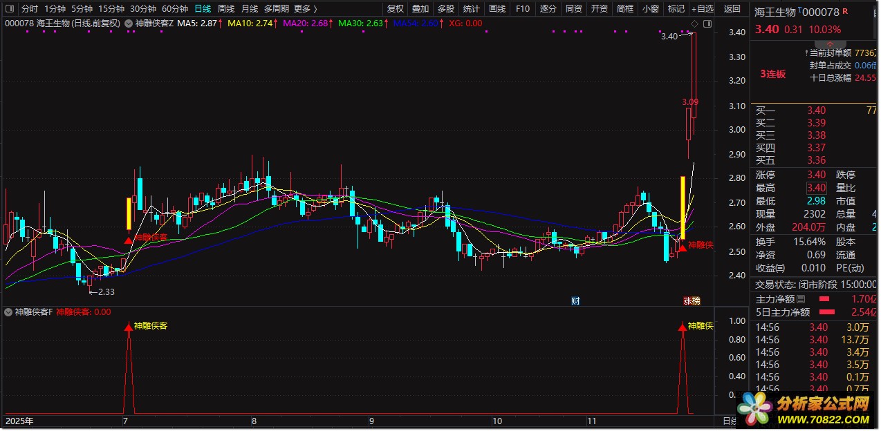 当满足所有条件时,在K线图上显示黄色实体,并在低位显示"神雕侠客"文字标识,同时用红色箭头明确标记买入点位置。