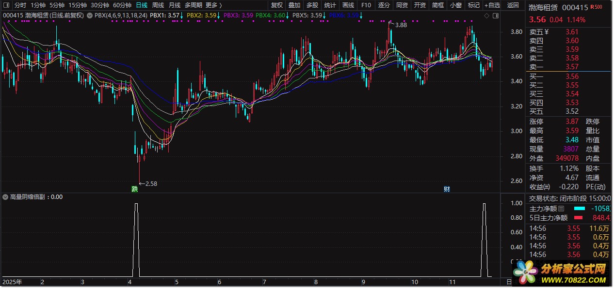 在大跌中末期,出现高量(不分阴阳)后,第二天出现缩倍阴(一定要阴线),就是当天尾盘买 ,比如14:50分左右,我们为什么总是强调尾盘买 ,因为尾盘才可以确定当天是不是缩倍量,是不是阴线,因为尾盘量价基本定型,这样才不会模棱两可。