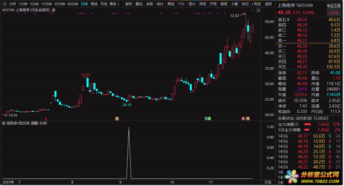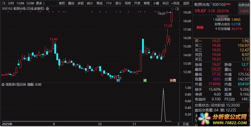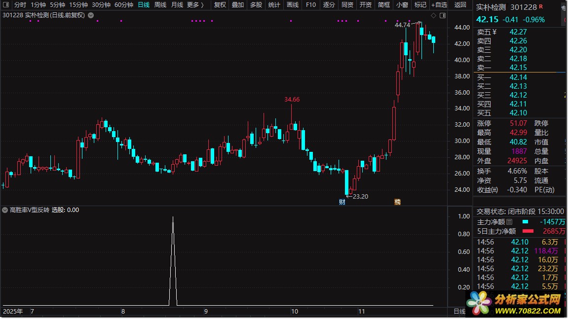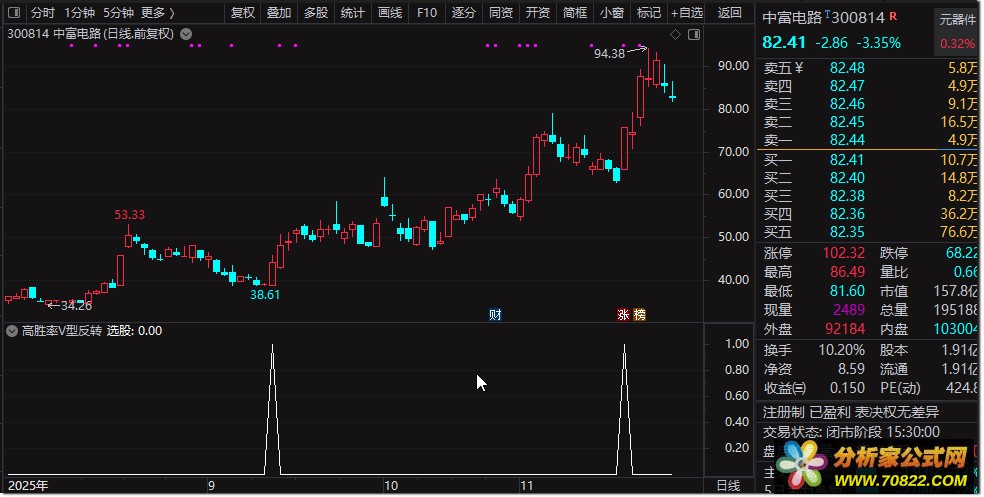 〖高胜率V型反转〗Deepseek V3.1 高胜率V型反转选股策略 核心借鉴胜率超80%策略(如MACD多周期背离87.69%、乾坤资金副图71.04%、抄底C浪主图84.07%)的共性: