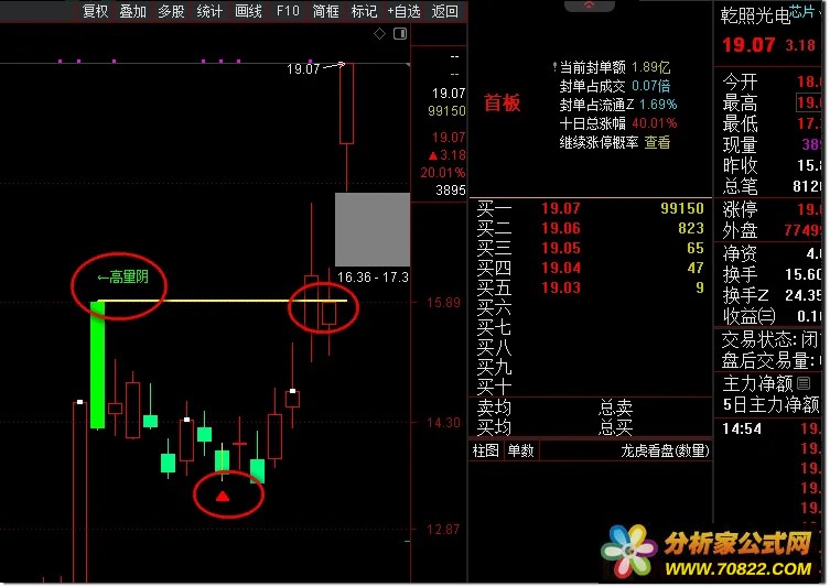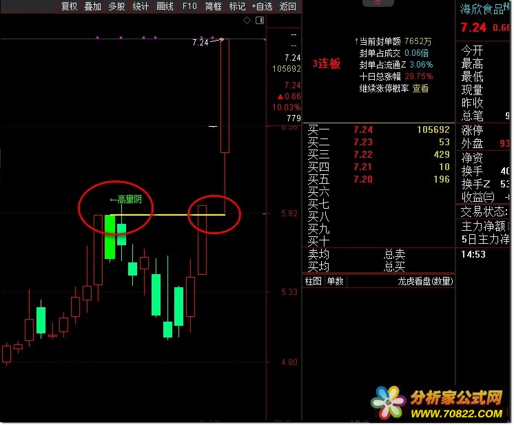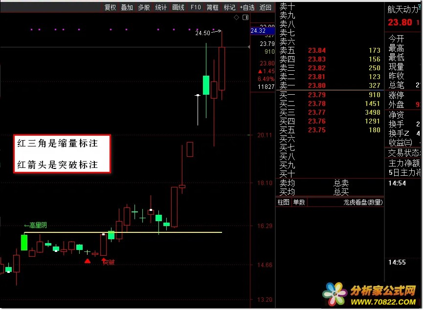 〖突破高量阴主图〗突破或即将突破为介入点 本主图指标,高量阴顶部向右画横黄线,在突破或即将突破的地方进入,就是主升,红三角就是缩量标注。