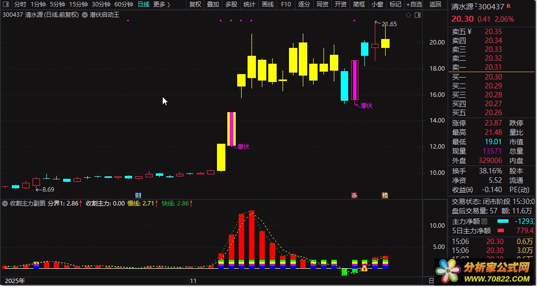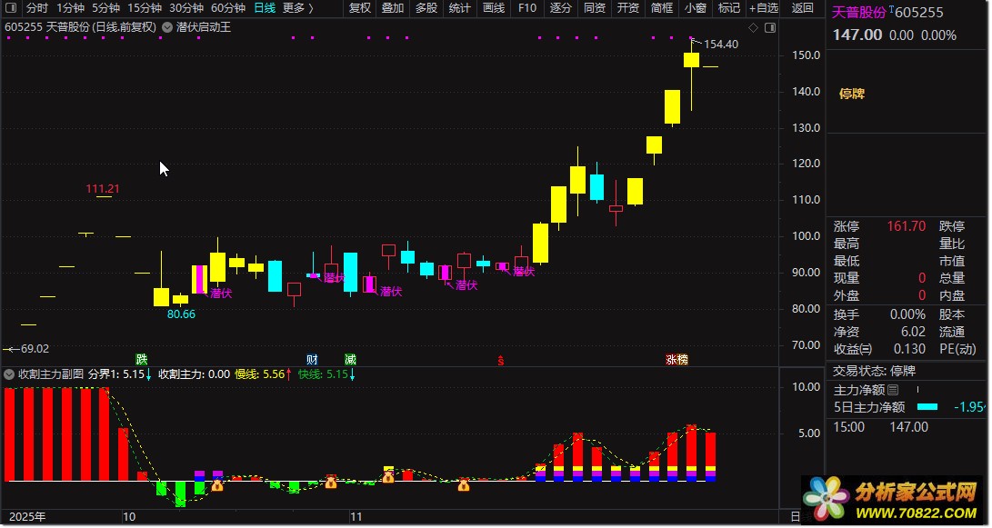 潜伏标记:当信号线金叉且收盘价创新高时,标注“↖潜伏”文字与粉色柱状线,指示最佳介入时机。