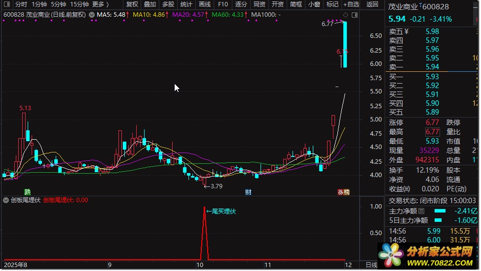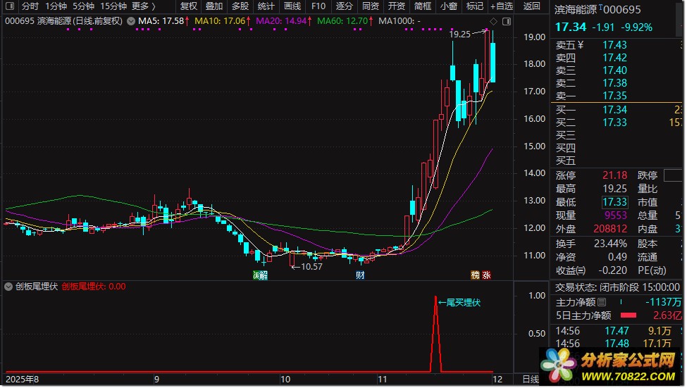 本指标通过分析移动平均线与阴线实体、最高价之间的量化关系,精准识别具有次日上涨潜力的个股。当价格形态满足特定条件时,系统将在收盘前生成尾盘买入信号,提示投资者把握短线机会。