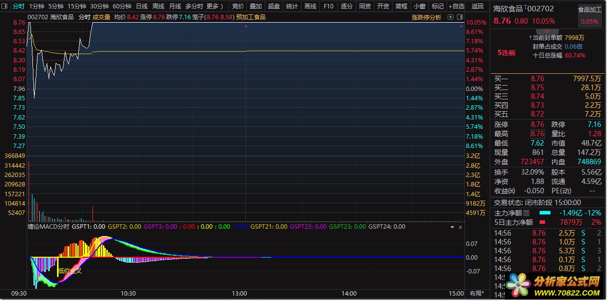 智能识别“低位金叉”“二次金叉”等买入信号,黄色柱体标注“底背离”提示底部反转;