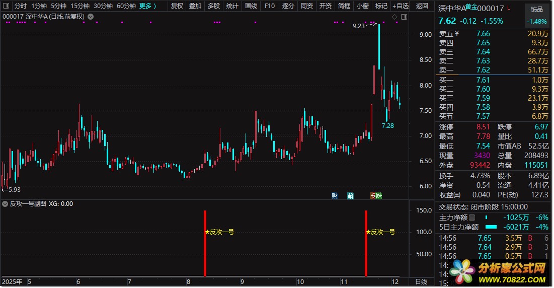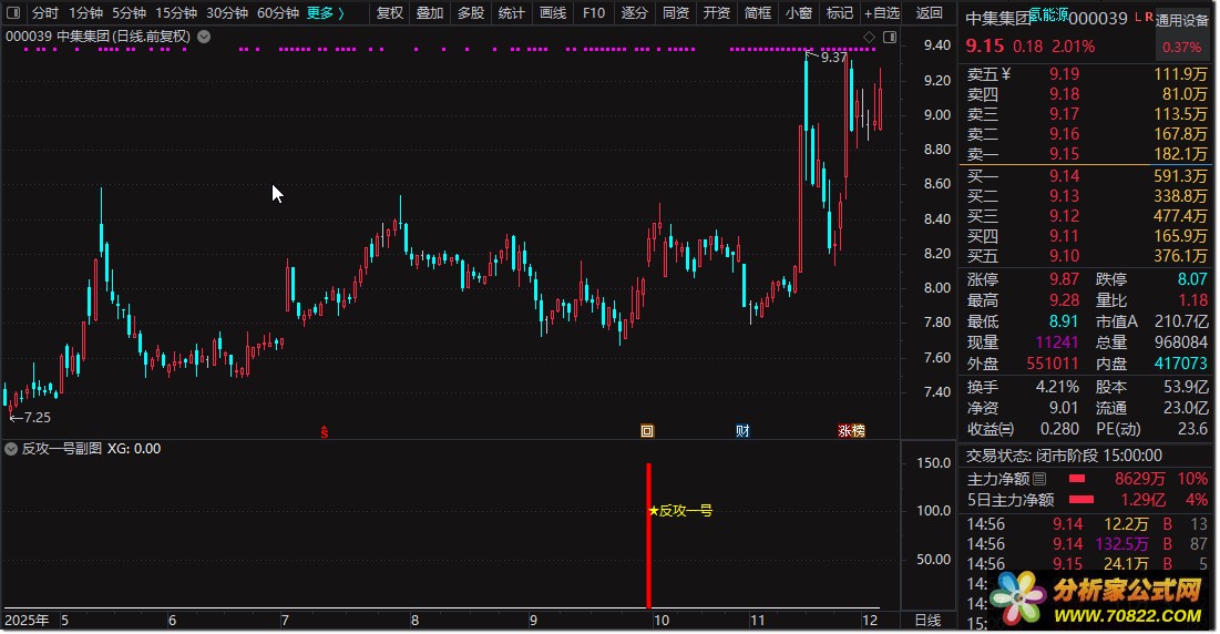反攻1号指标通过加权价格计算与线性趋势分析,精准捕捉底部反转信号。其核心逻辑为赋予收盘价更高权重计算均价,结合递减权重计算多期趋势值。当短期趋势线上穿长期均线、当日收阳线、成交量明显放大且涨幅适度时,触发买入信号并在图表中清晰标记。