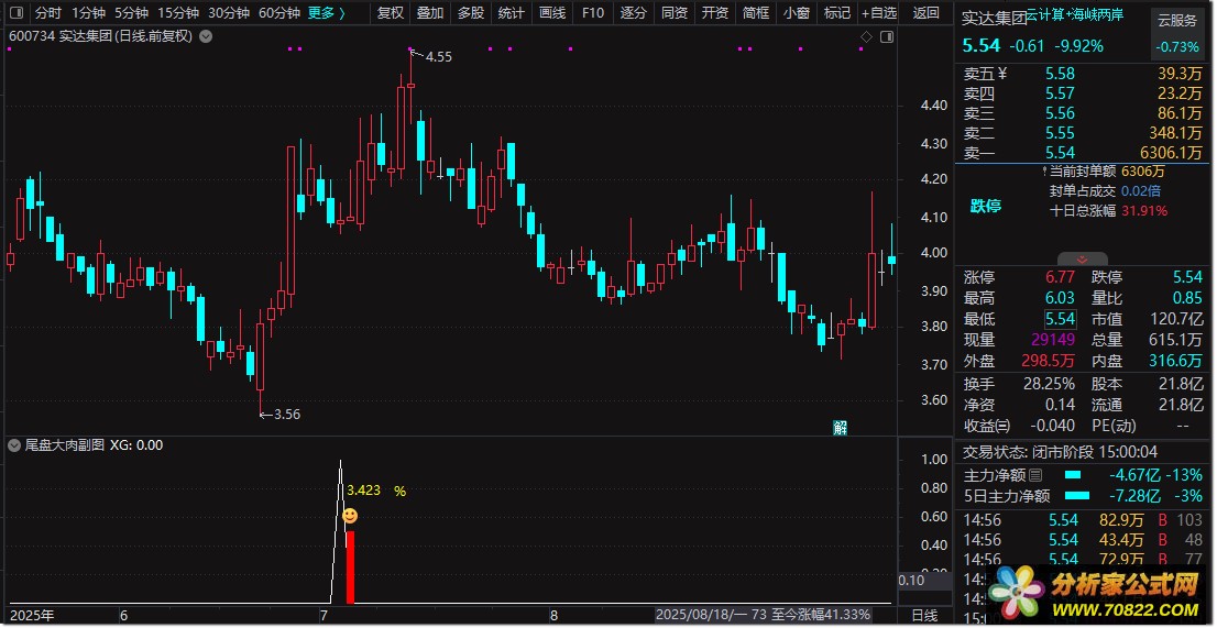 〖尾盘大肉〗副图策略 成功率87%短线今买明卖技巧 指标使用说明: