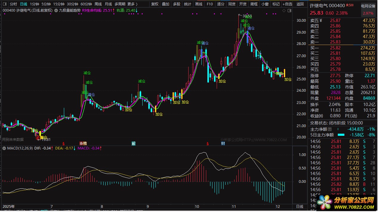 1. 主趋势线:R9生命均线(紫色粗线)由两个不同的9周期复合均价计算而成,能平滑价格波动,清晰指示中长期趋势方向。其“上拐”信号可用于辅助判断趋势启动。