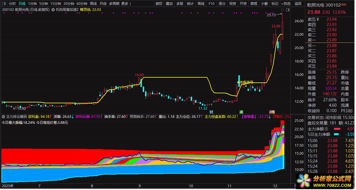 〖主力持仓筹码分布〗一眼看穿主力底牌!精准捕捉资金动向 本公式是一款聚焦主力持仓与筹码分布的实战型指标,核心通过 WINNER、COST 等函数量化筹码数据,既展示获利盘、活筹、主力仓位、控盘系数等核心数值,又以彩色区间直观呈现 0-99.99% 分位的筹码成本分布,同时附带换手率、量比、当日波幅等辅助数据,全方位刻画筹码结构与主力资金动向。