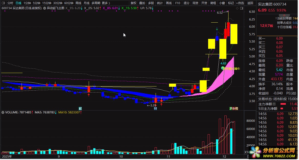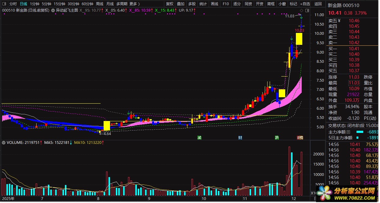 1、核心信号识别:黄色 K 线代表股价站上筹码中位(UP),红色 K 线为突破 15% 筹码位,蓝色 K 线则跌破 85% 筹码压力位;涨停 K 线高亮黄色显示,辨识度拉满。