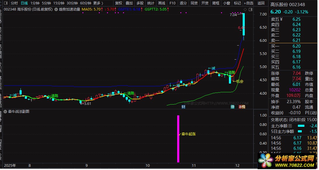 该副图公式聚焦“牵牛起涨”核心逻辑,先通过gspt1-gspt5过滤6/7/8开头股票及无成交标的,再整合多周期均线(5/10/20/60/125/250日)、强弱指标(gspt16-gspt19)与量价关系,筛选均线多头排列(gspt22)且短期放量突破关键均线的优质标的,最终以红色柱状线+“↙牵牛起涨”文字信号,直观提示潜在起涨点。