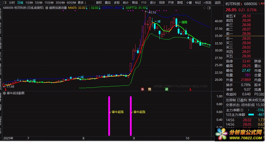 1. 副图出现红色柱状线+“↙牵牛起涨”文字,即为核心买入信号,代表个股均线多头、量价配合到位,短期上涨概率较高;