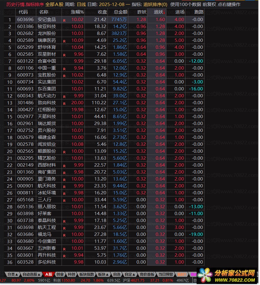 〖追妖排序〗指标解析:专抓龙头妖股 聚焦“追妖”排序首位策略 追妖排序指标——精准锁定龙头妖股的交易策略,核心原则为“只买追妖排序首位个股”。该指标通过收盘后排序筛选,次日专注操作排序第一标的,若首名与次名数值相同则放弃操作,确保选股严谨性。