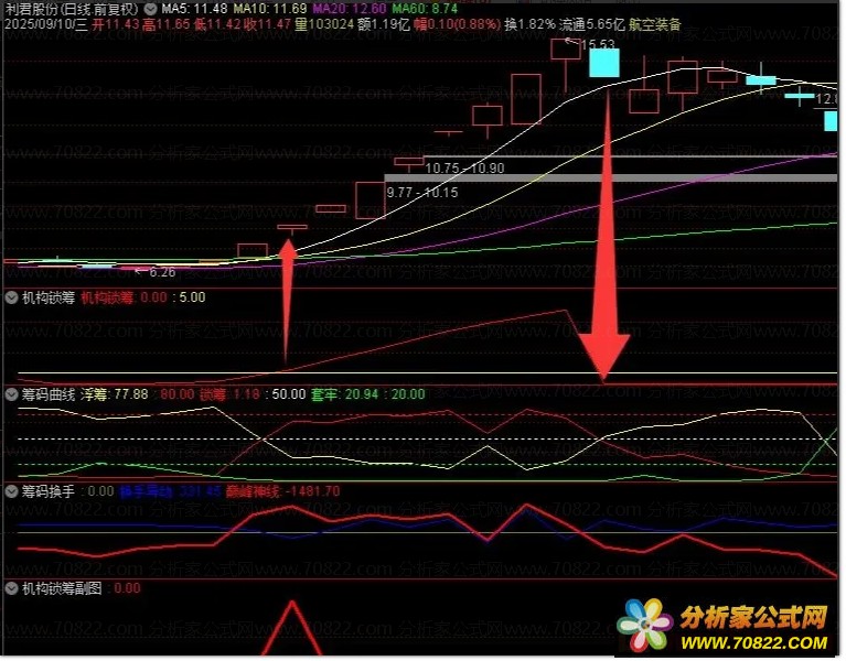 筹码曲线副图:锁筹线 上穿 套牢线 是进场信号。