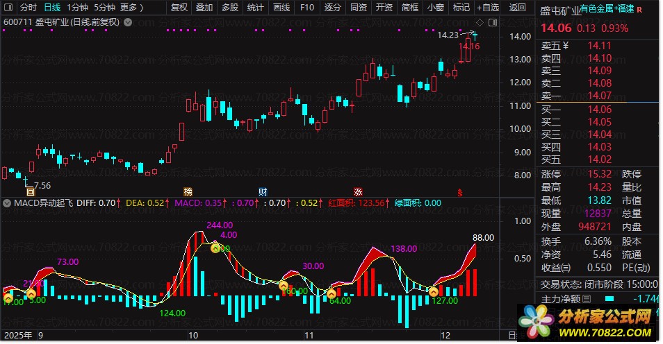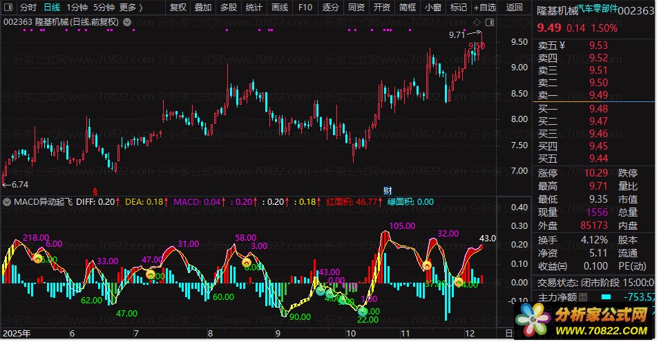通过DKB(60日均线加强化MACD)与DKA(60日均线加强化信号线)构建趋势通道。三重过滤机制:长期看60日均线,中期依托DKB/DKA通道,短期通过双MACD交叉验证,层层过滤虚假信号。