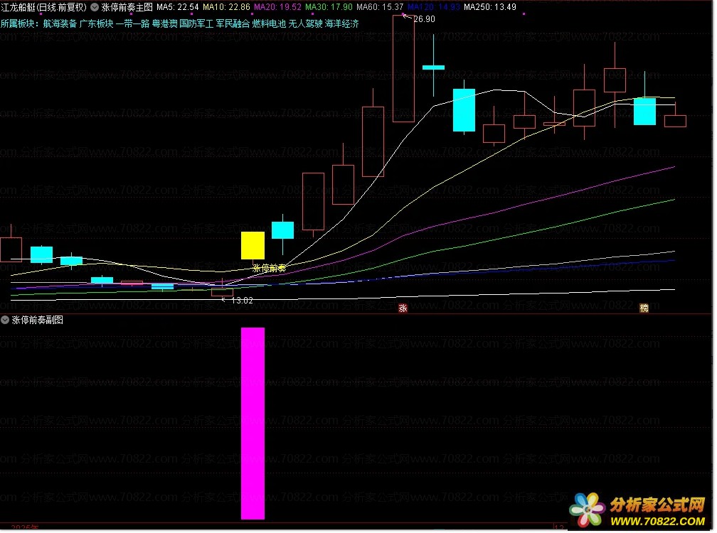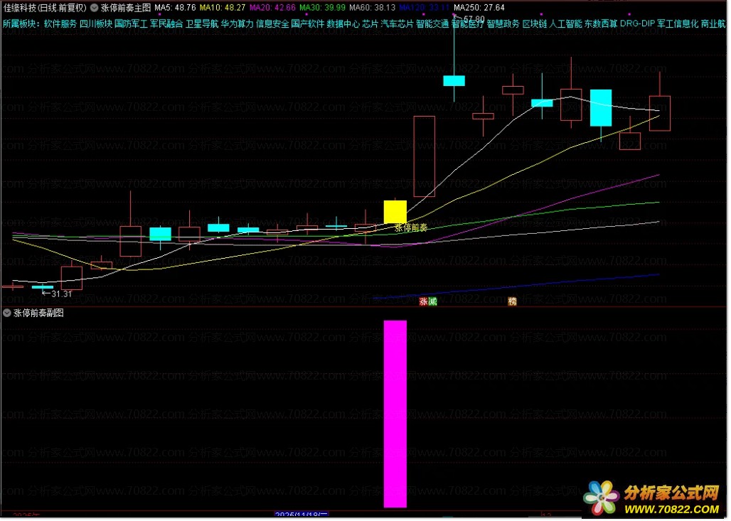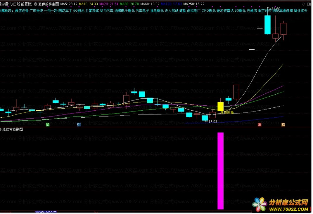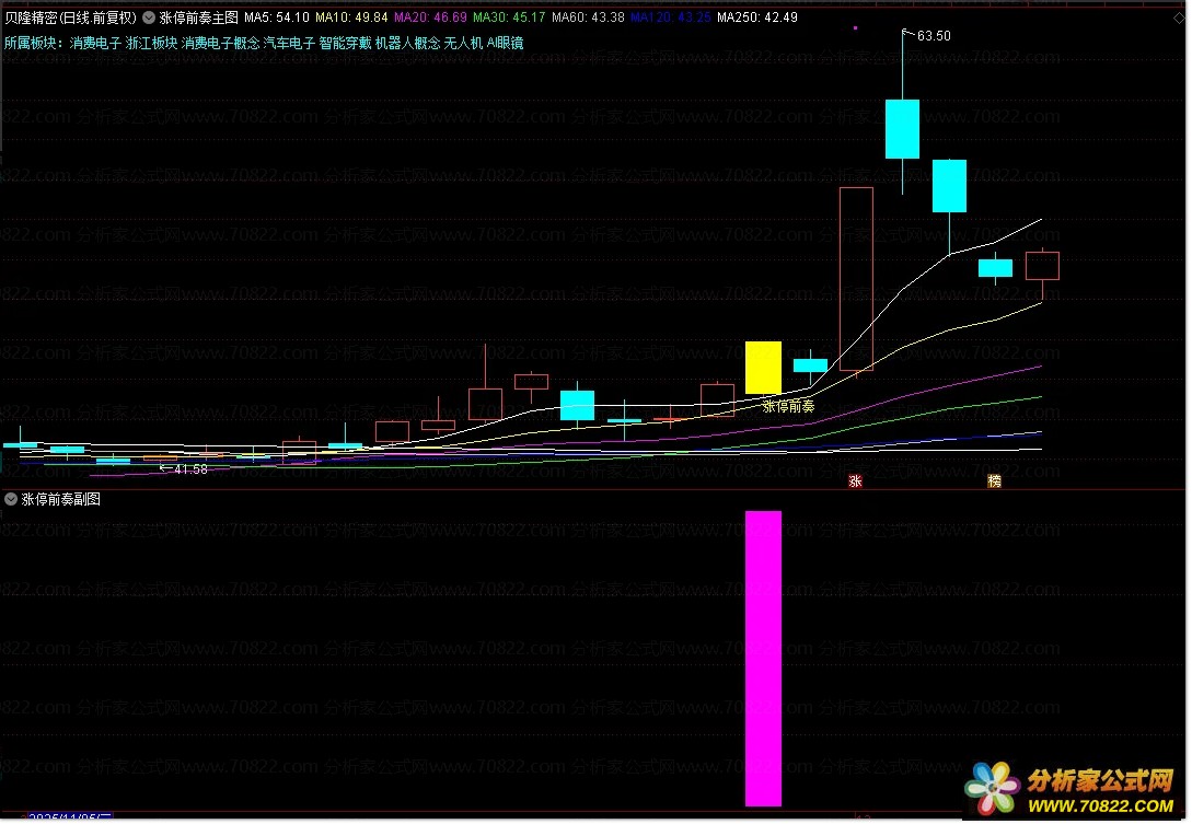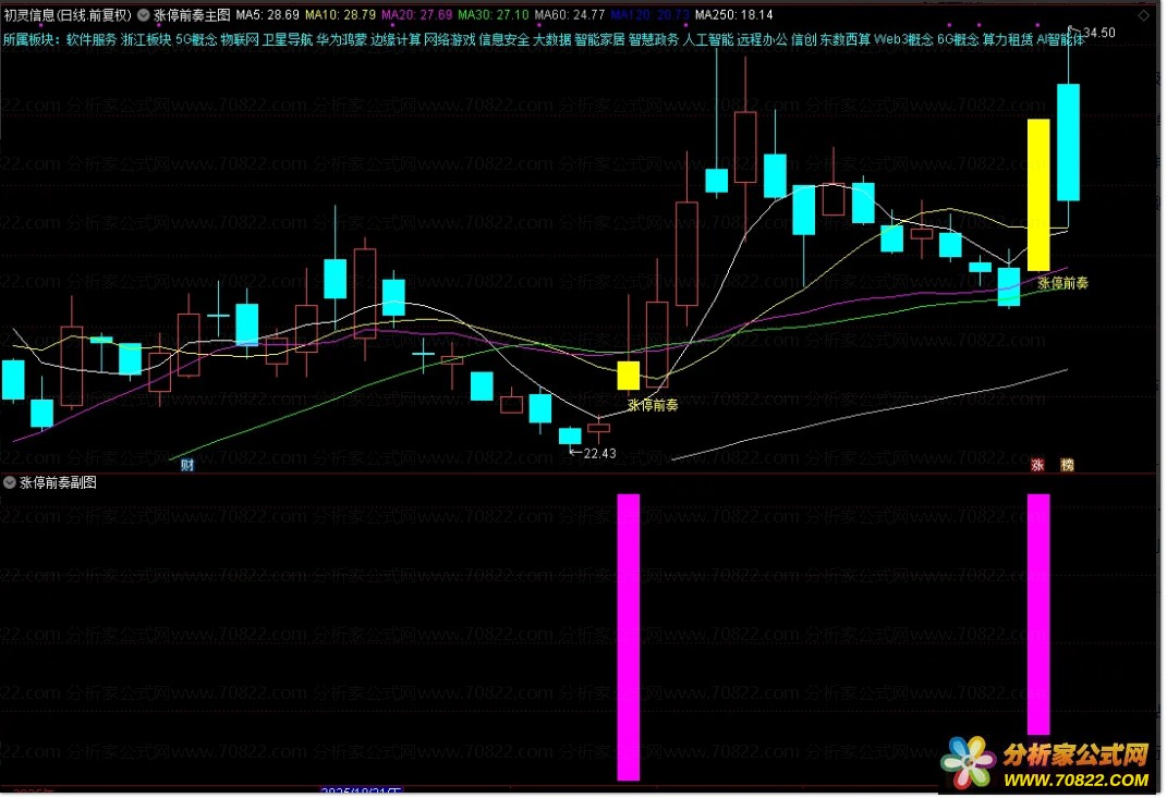 2025【涨停前奏】主图幅图选股识别股票可能涨停的前奏信号 没未来函数 该指标专为捕捉股票涨停前兆信号设计,通过价格强度、成交量放大及技术指标共振综合研判。核心逻辑聚焦近期(2日内)量价齐升特征——要求收盘价较其EMA上涨超6%,同时成交量较其EMA放大1.6倍以上,辅以价格动量指标VAR1呈上升态势且未超买(前值低于89),叠加市场整体向好条件(如涨跌家数差为正),形成VAR12触发条件。另一关键要素VAR16依托MACD动量,当MACD柱状线变化率上穿13阈值时,确认上涨动能加速。当VAR12与VAR16同步满足时,输出“涨停前奏”信号,提示在量价协同与技术指标加速上行共振下,股价可能即将冲击涨停。该策略注重强势启动点捕捉,兼顾趋势确认与动量过滤,有效平衡信号稳定性与实战性。