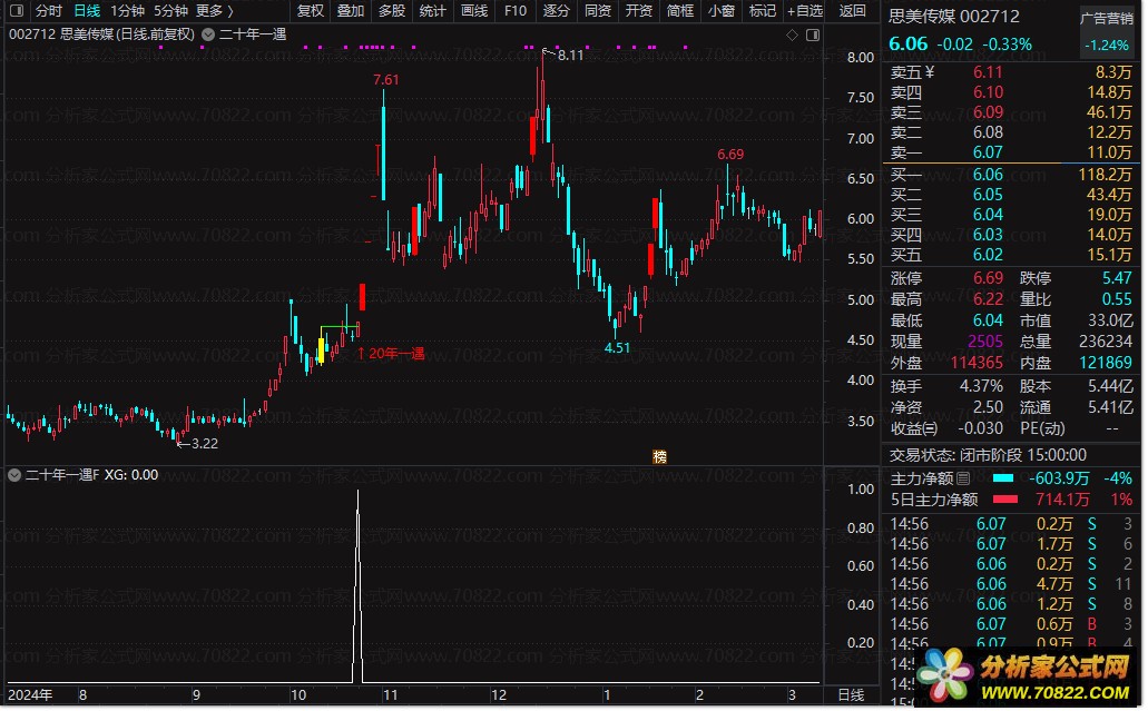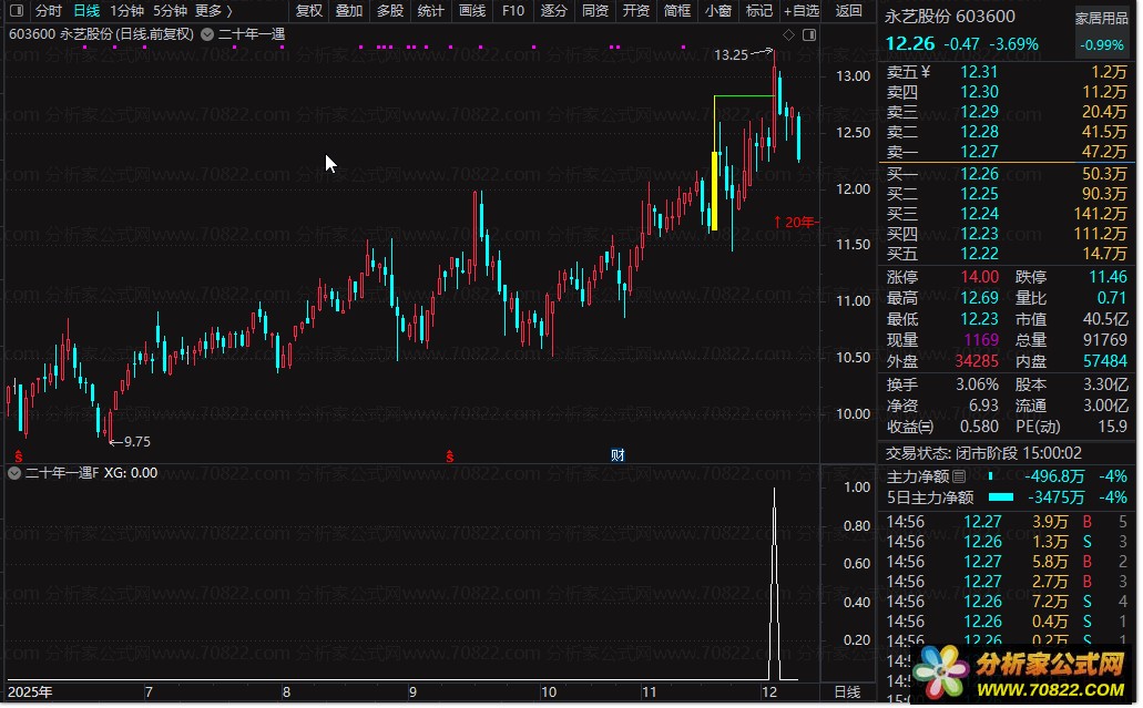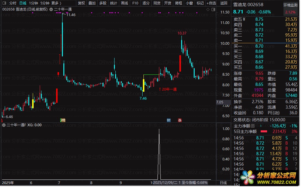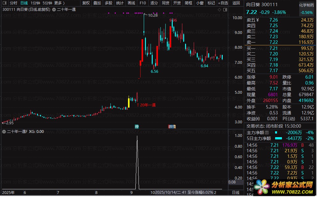 本次分享同步更新指标内容,量化系统包含主图指标与选股指标。当主图指标发出信号时,将显示一条黄色水平实线,并在K线下方标注“20年一遇”字样。