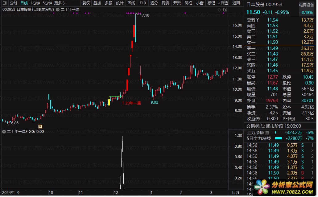 某日丰股,指标信号在2024年12月9日出现,次日介入后开启主升浪,连续拉升5个涨停板。