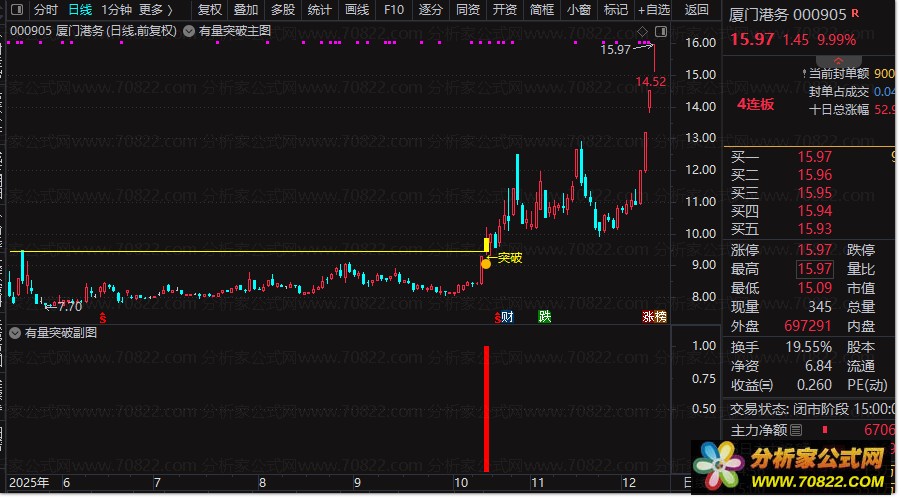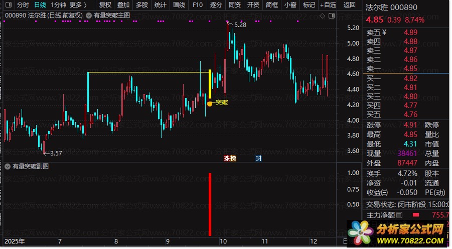 〖有量突破〗主图指标,自带画线 突破前期大阴K线黄柱确认信号 本指标包含1主图1副图1选股公式,信号仅作参考学习,不构成投资建议!