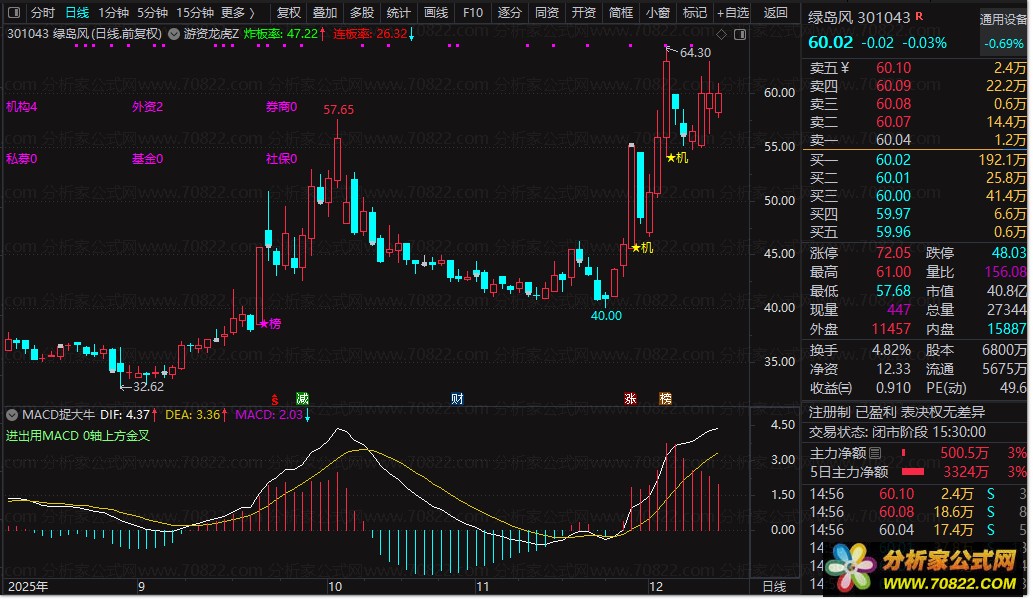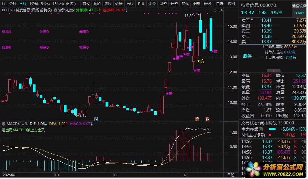 【游资龙虎Z】把"榜"或者"机"写在主图上+【连板率+炸板率】 把上过龙虎榜单的信号在主图作标识!信号图如下:这里我作了一个数据修改,当龙虎榜上面机构数量大于=3时,标注为"机",这样大家能更好分辨该龙虎榜是【游资榜】还是【机构榜单】,对于我们超D来说,游资榜单才是重点关注对象吧!数据没问题哈!至于副图可以使用之前分享的那【打榜龙虎榜】,它会有龙虎上面的资金数据明细