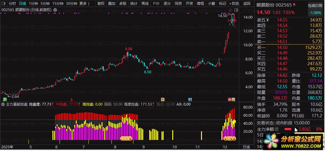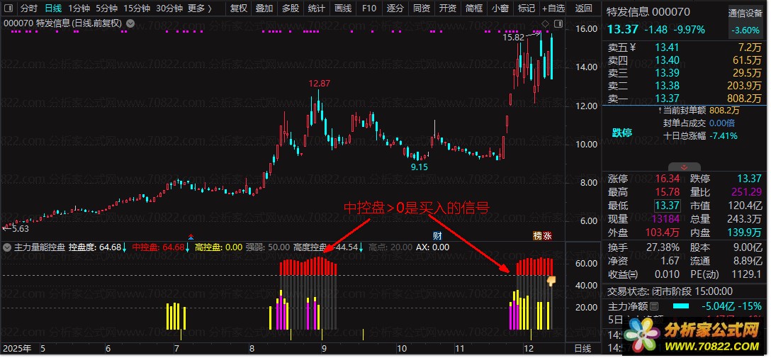 1. 控盘度数值:≥60为中控盘(红色柱)、≥80为高控盘(黄色标注),数值越高主力控盘越强;