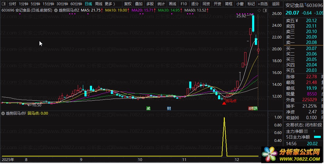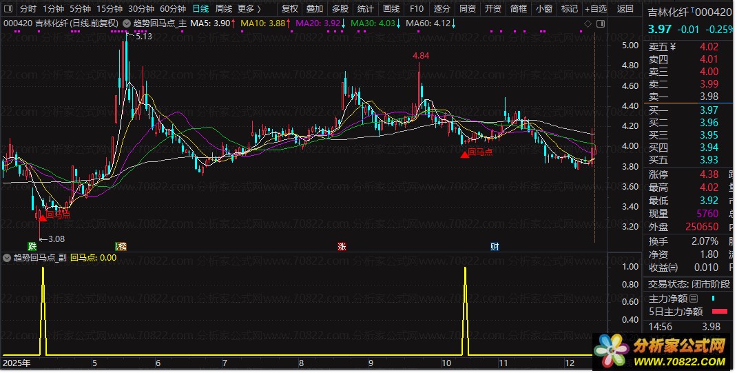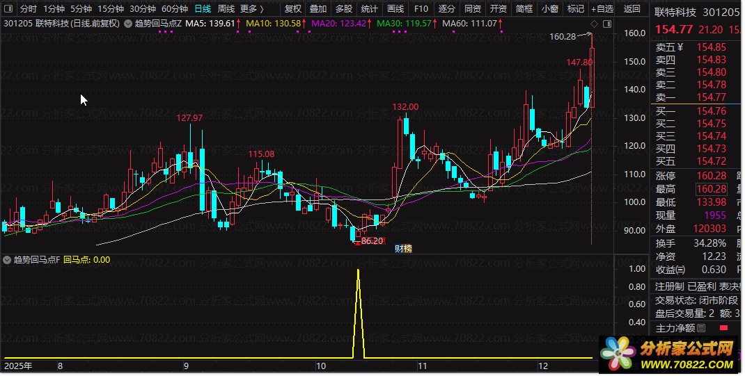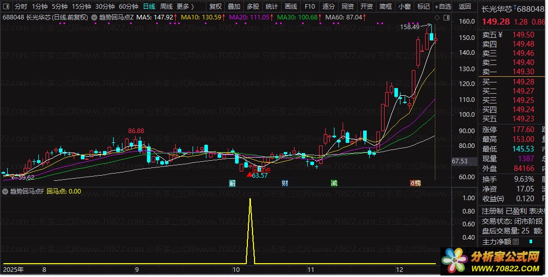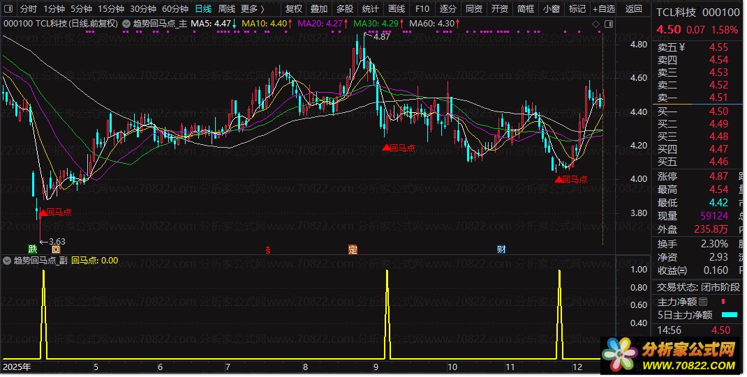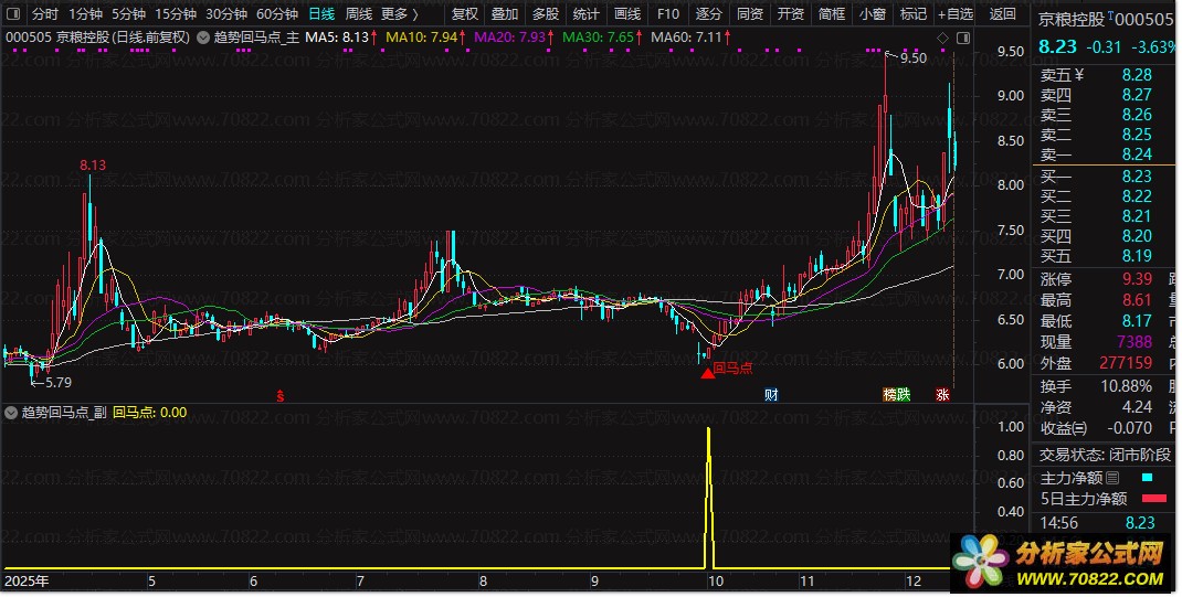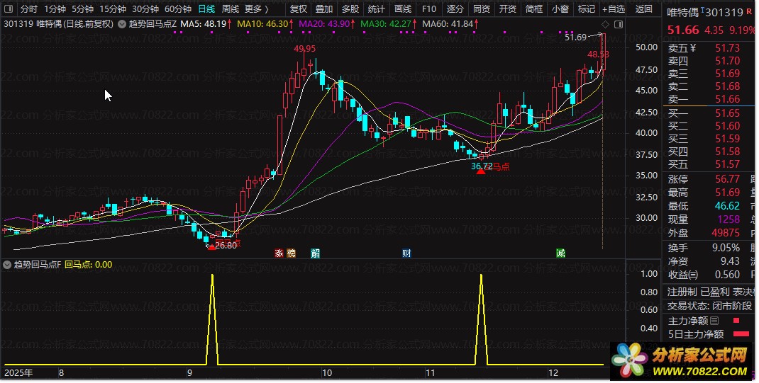 通过5/10/30日均线多头承接、动能指标金叉、超跌反弹等条件共振,筛选出高胜率的“回马点”买入信号,信号出现时会在K线下方标注红色“回马点”文字及图标,直观易懂。