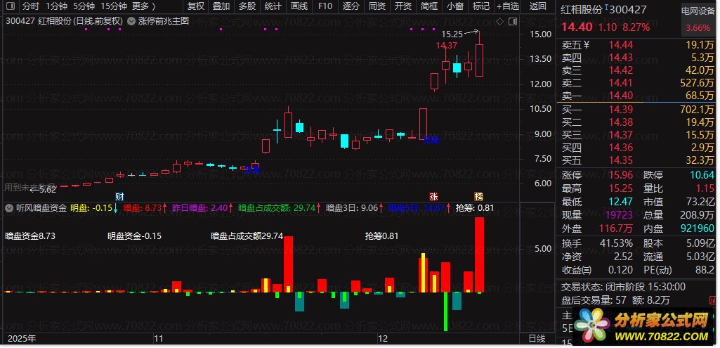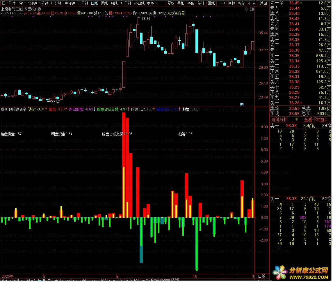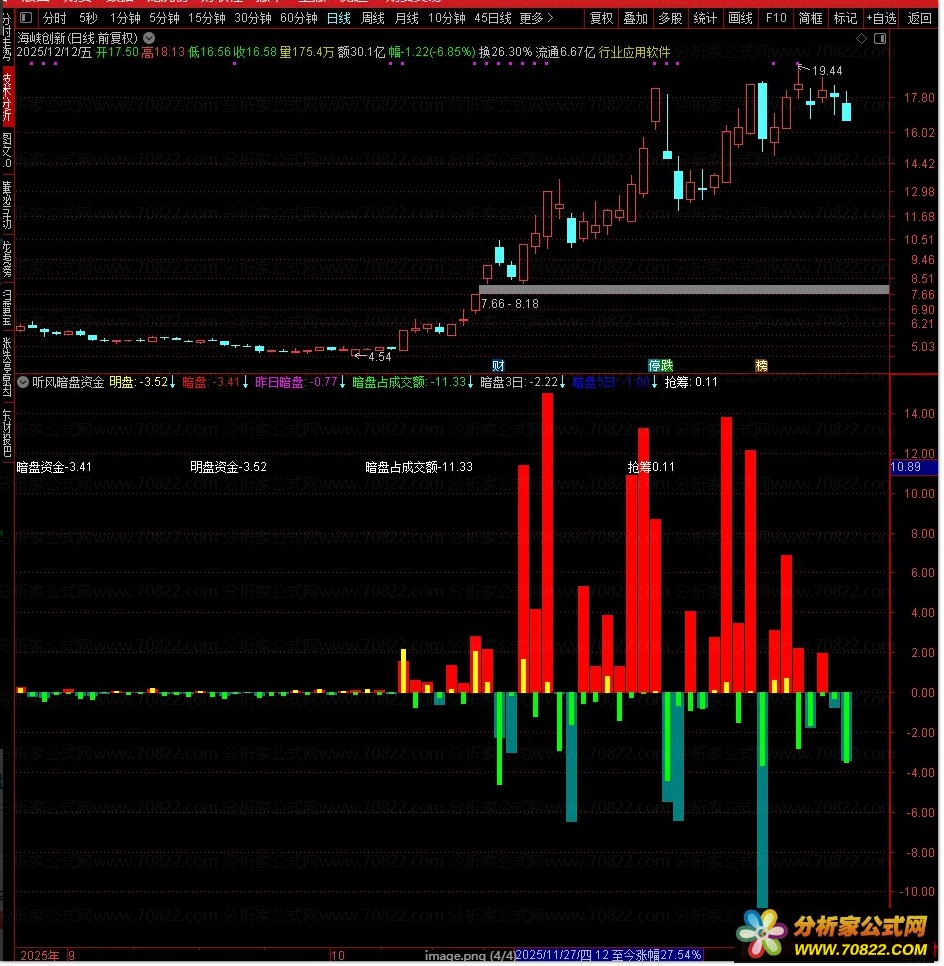该指标特别适合关注主力资金动向的投资者使用,通过暗盘资金数据的可视化呈现,帮助用户更清晰地识别资金进出节奏,在实战中提升操作胜率。作为官方高价指标的平替优化版,其性价比优势显著,是通达信用户不可多得的自用级资金分析工具。