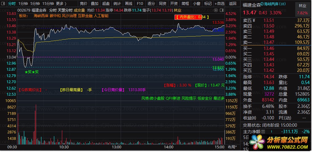 3、观察资金的净流入情况:集合竞价阶段资金净流入较大,说明有资金介入,有可能出现强势表现。