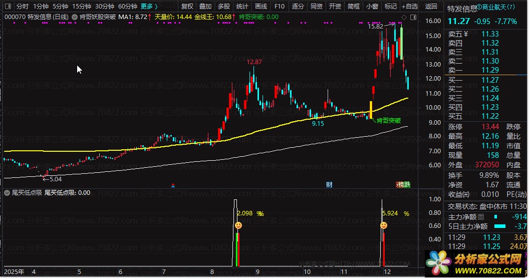 尾盘低吸交易策略:信号出现后建议尾盘介入。次日若股价低开但盘中反弹,可择机止盈或设置止损位;若次日高开,则需确保股价不跌破信号当日最低价,否则需及时离场规避风险。