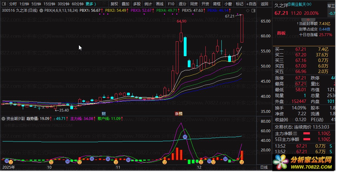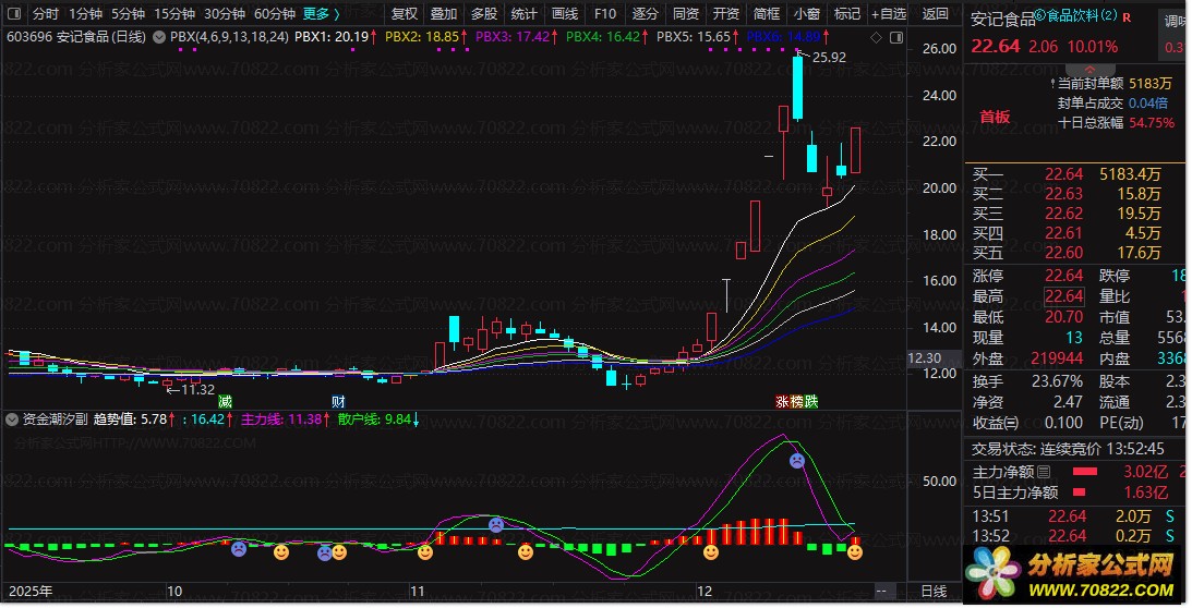 2、操作信号解析:当副图出现笑脸图标即为买入信号,预示短期强势启动;紫色均线上穿红色柱状或绿色柱状区域时判断走强,可持仓或加码;紫色均线下穿绿色柱状区域时需考虑止盈离场,避免利润回吐。