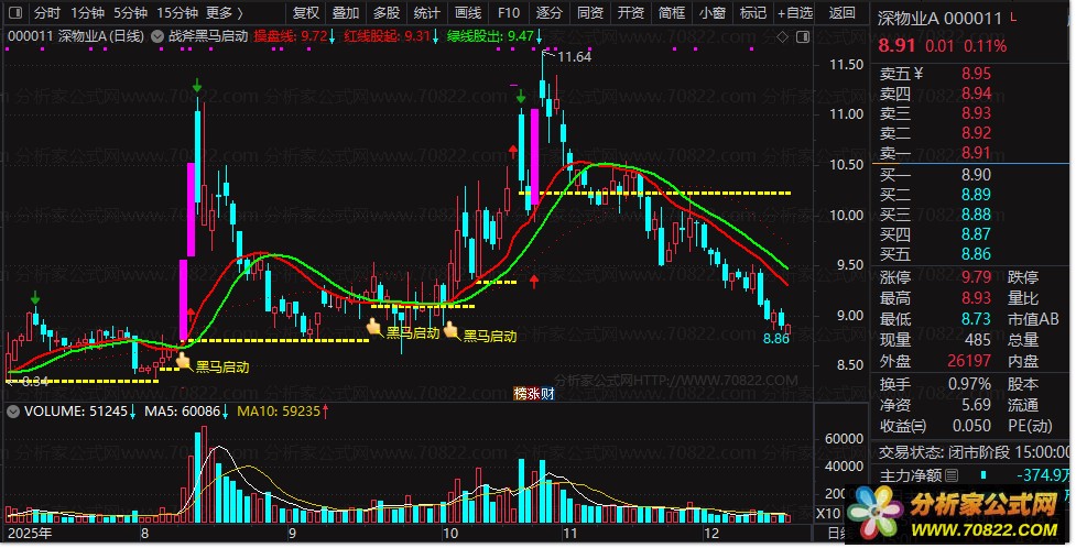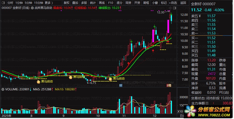 ✅ 【黑马启动】信号——通过量能突增、突破关键结构、趋势线共振三重条件触发,主图呈现立体金手指信号(★),专抓主升初期阶段。该信号为多因子触发提示,需结合自身策略二次验证以提升判断准确性,信号提示仅供参考;