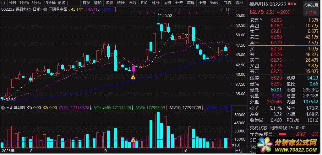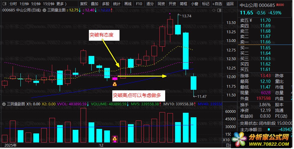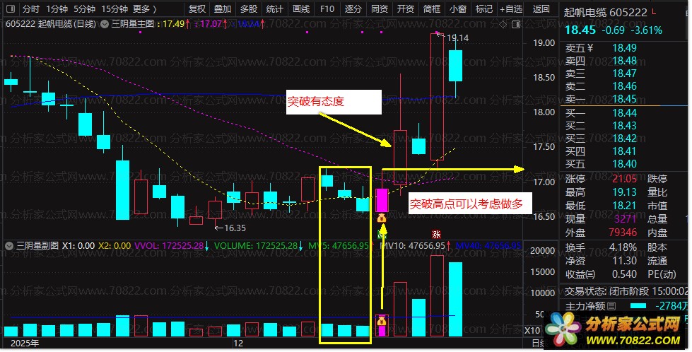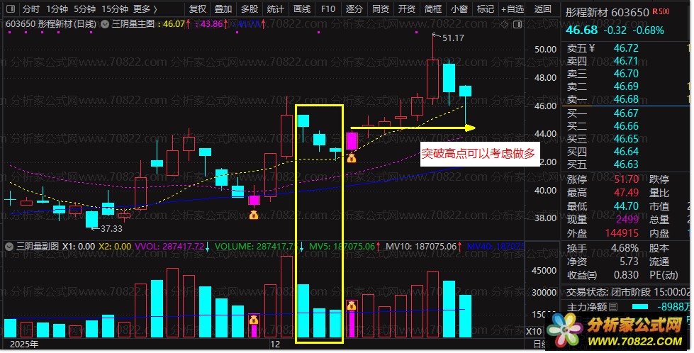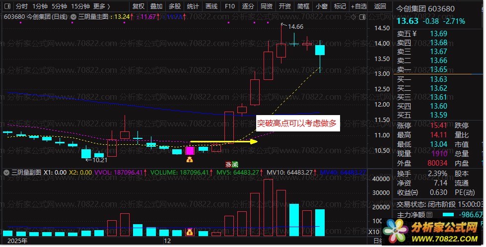 3、主图配置三条均线,重点观察均线呈多头排列且趋势向上时信号的有效性。
