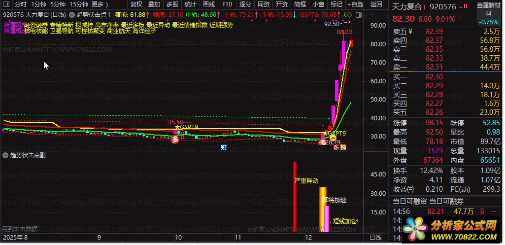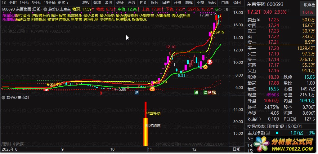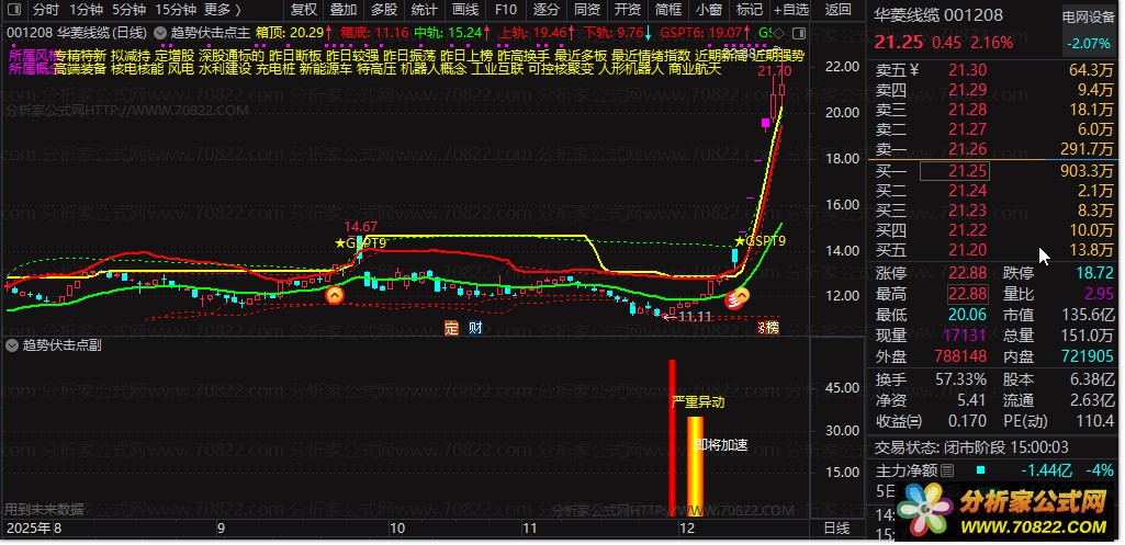 DRAWTEXT(FILTER(gspt81,15)=1,40,'严重异动')*gspt88,COLORYELLOW;