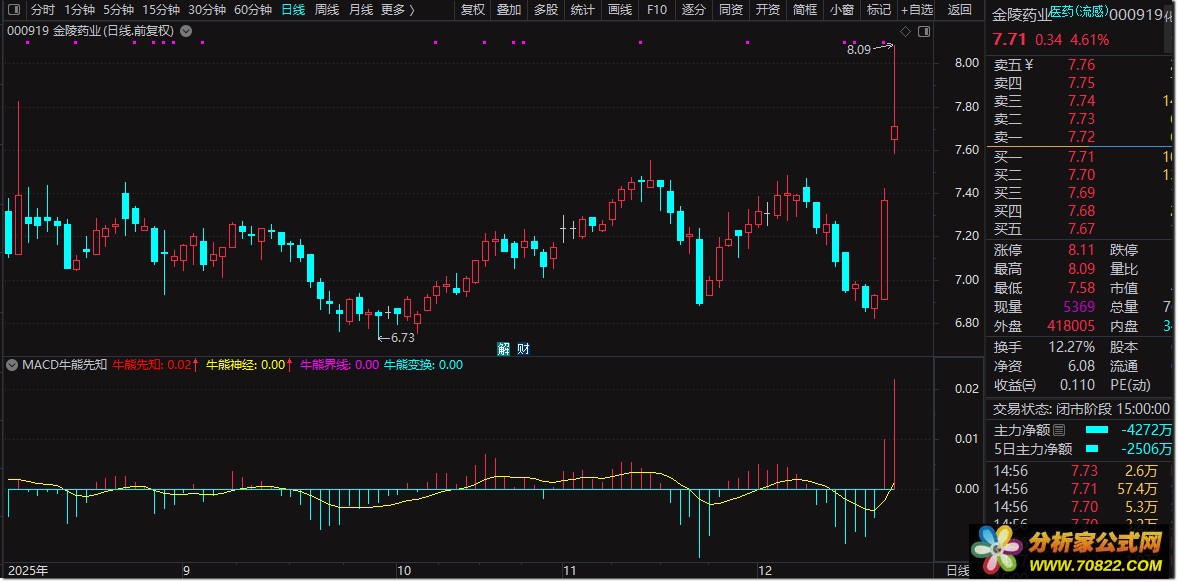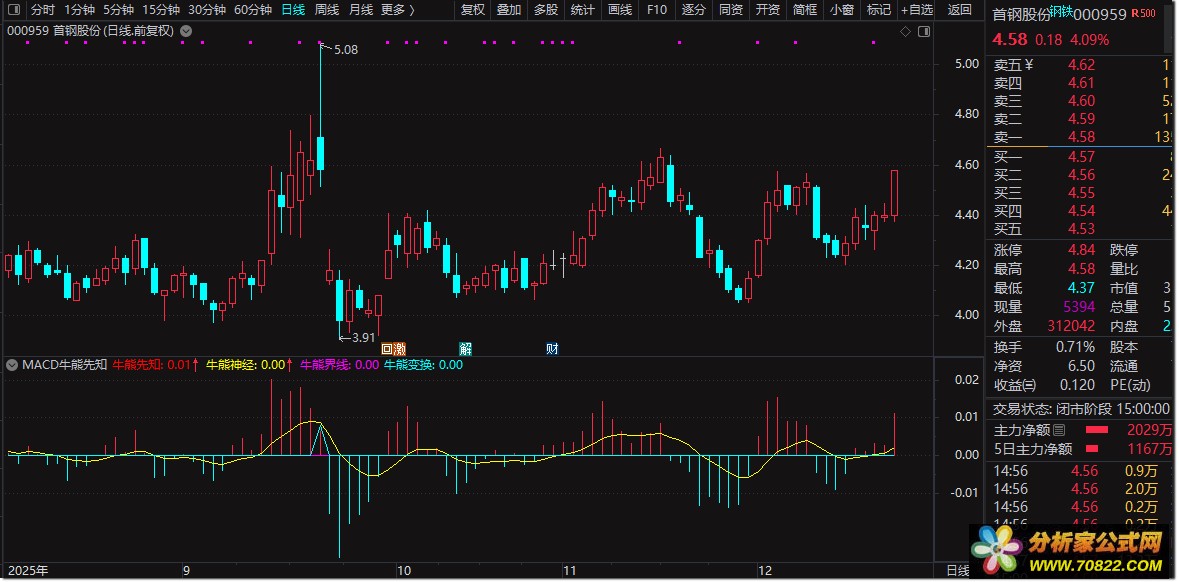副图“牛熊先知”“牛熊神经”数值为核心:数值回升如“牛熊神经”从负区间-0.01向上修复,显示下跌动能衰减,可关注趋势反转机会;数值持续回落同步股价回调时,提示趋势转弱需谨慎。