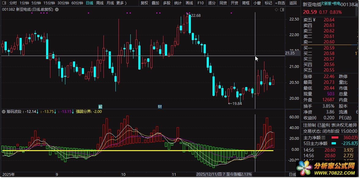 图中红色柱状线代表筹码强势区(筹 > 70日均线),暗示主力积极介入,是潜在买入信号;绿色柱状线则为弱势区(筹 < 70日均线),提示谨慎或离场。三条EMA均线(5/10/20)辅助判断短期趋势强弱,而-2黄色横线作为强弱分界,帮助投资者快速识别多空转换临界点。