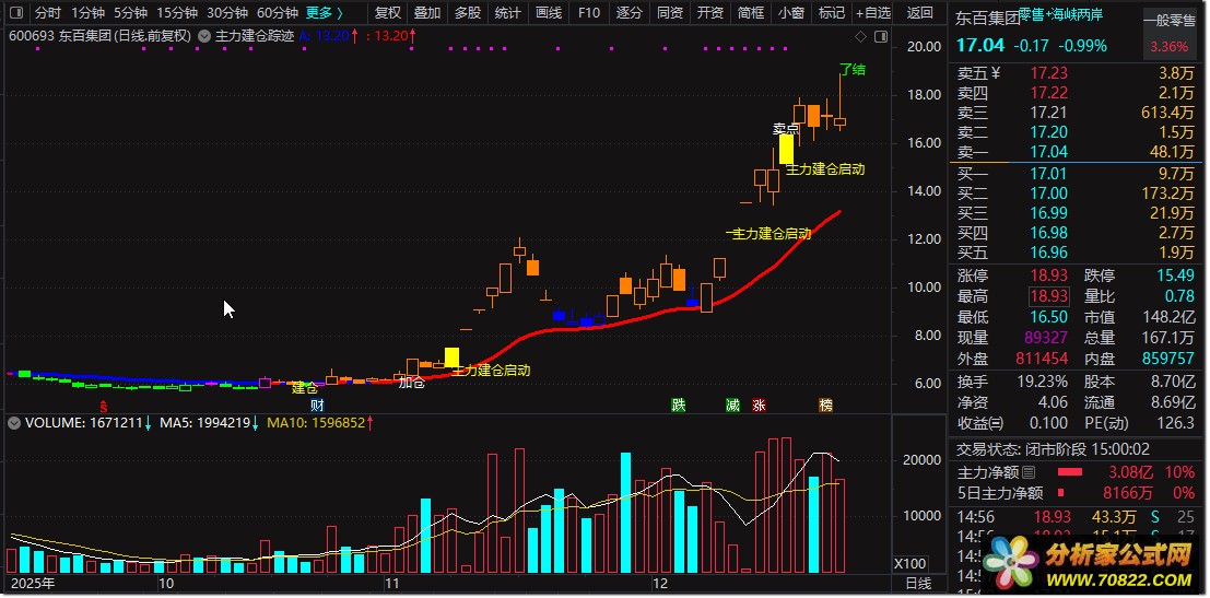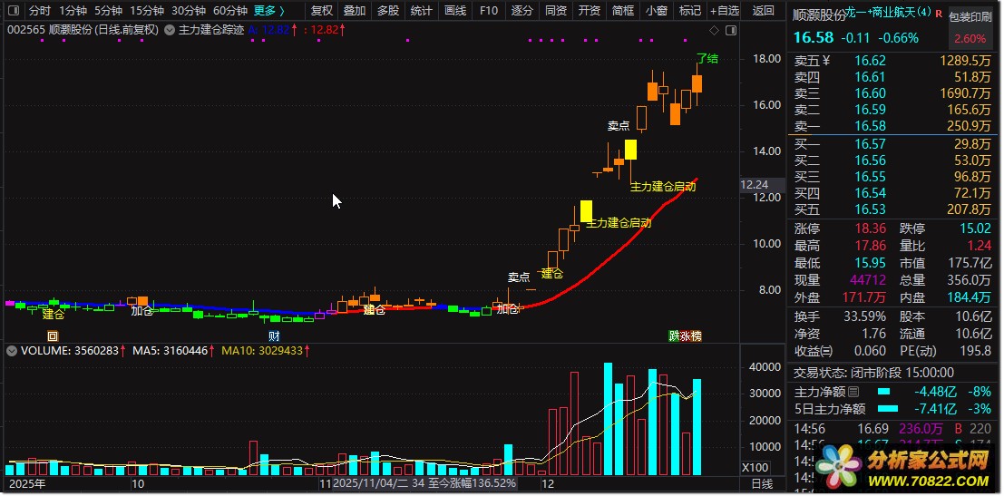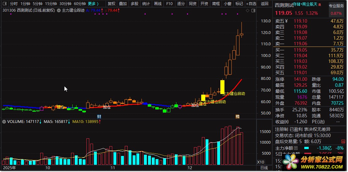 启动确认:月线级别高位延伸与量价配合时,出现“主力建仓启动”黄色信号。
