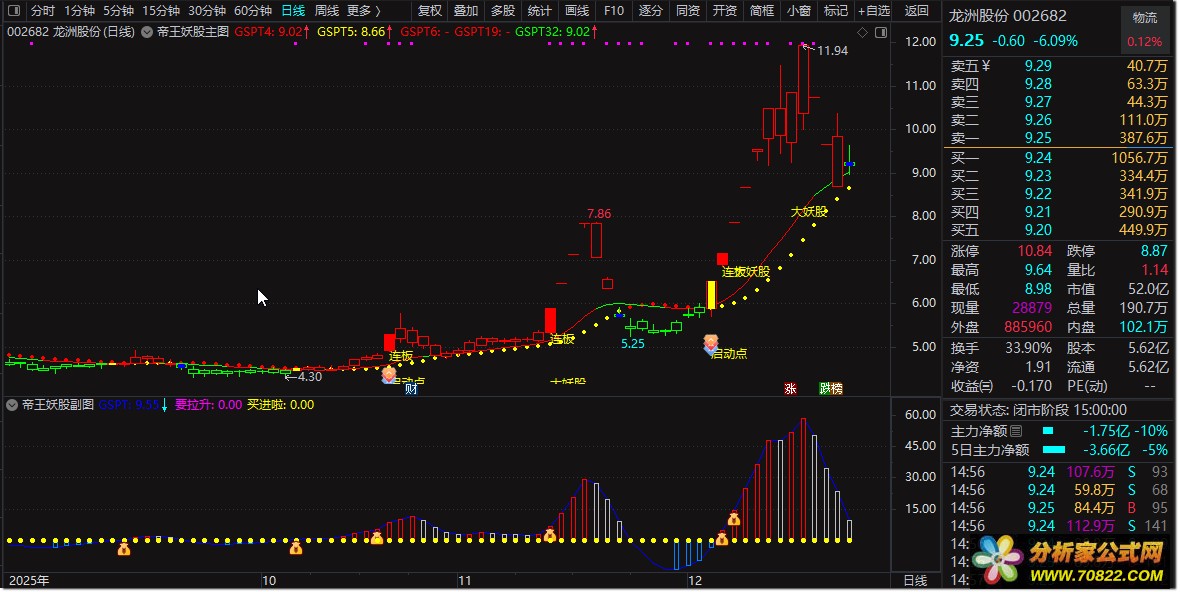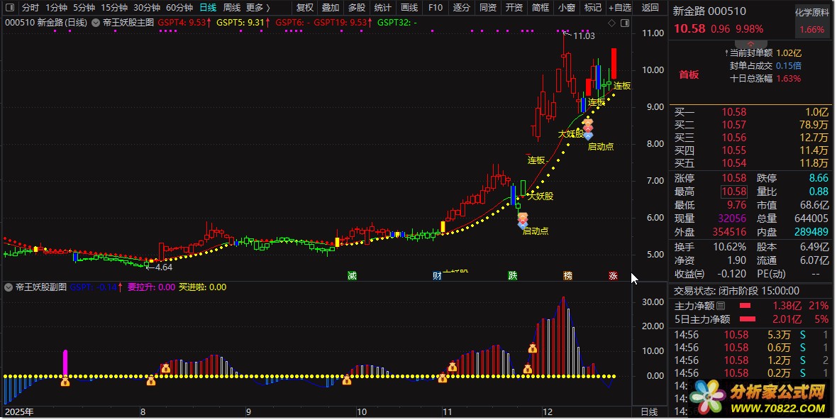 2. 启动信号:出现“启动点”+黄色图标,提示妖股启动,可重点跟踪;
