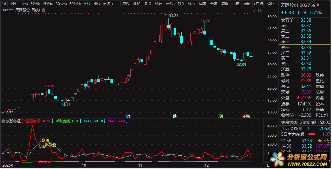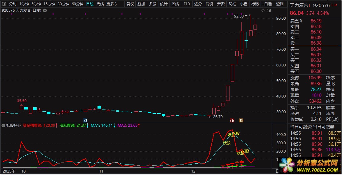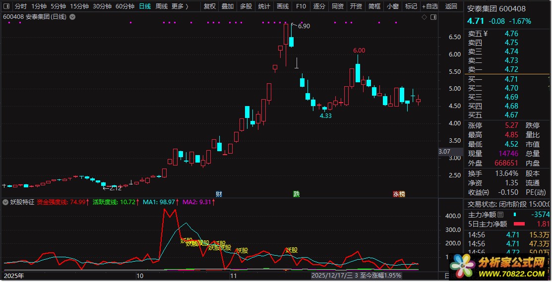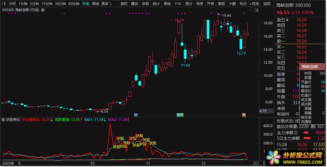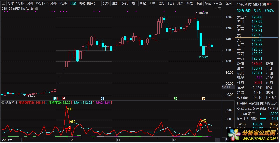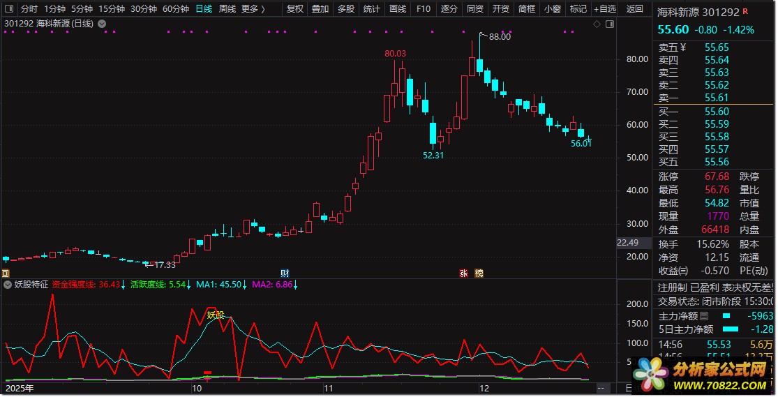 当上述条件同时满足时,K线下方显示黄色三角信号并标注“妖股”,副图以红/绿双线直观展示资金强度与活跃度动态,配合5日均线形成趋势追踪体系。