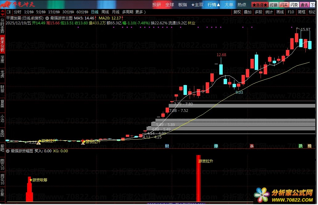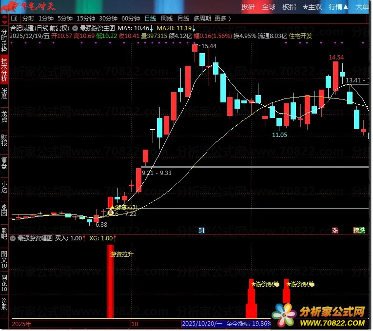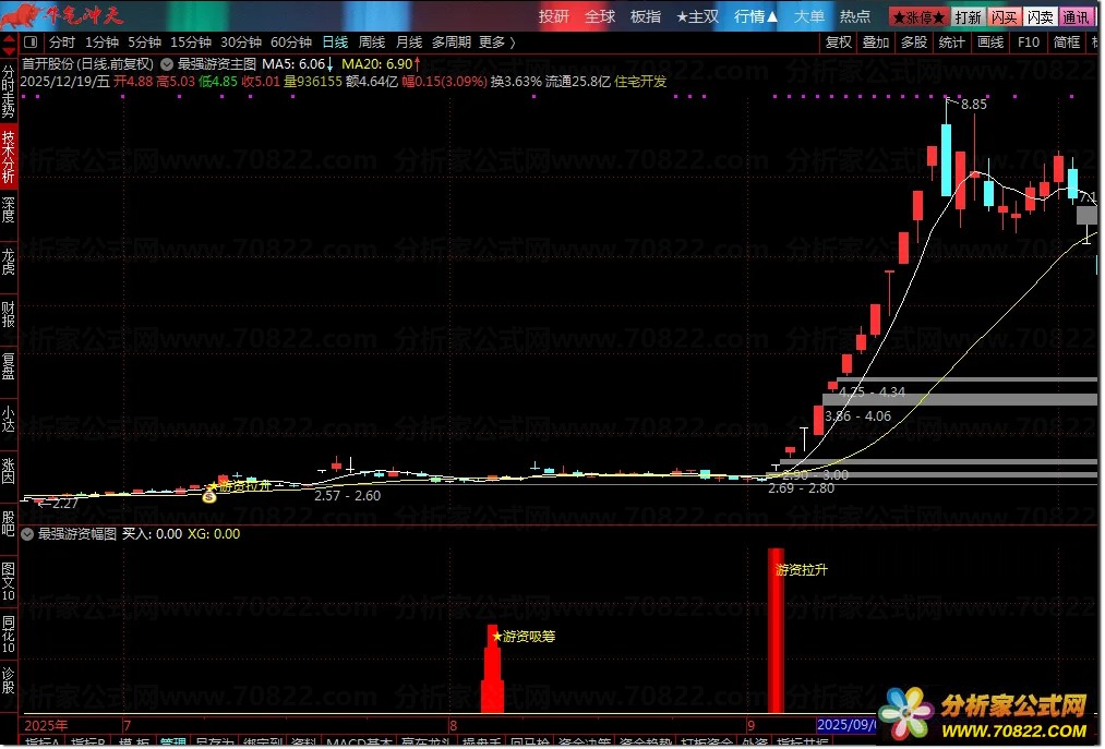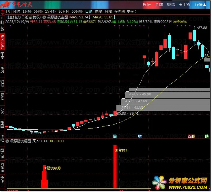 2. 副图中关注黄色“游资拉升”柱与红色“★游资吸筹”信号,结合紫色预警(XG)判断持续性机会;