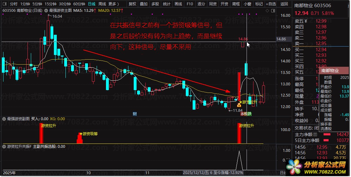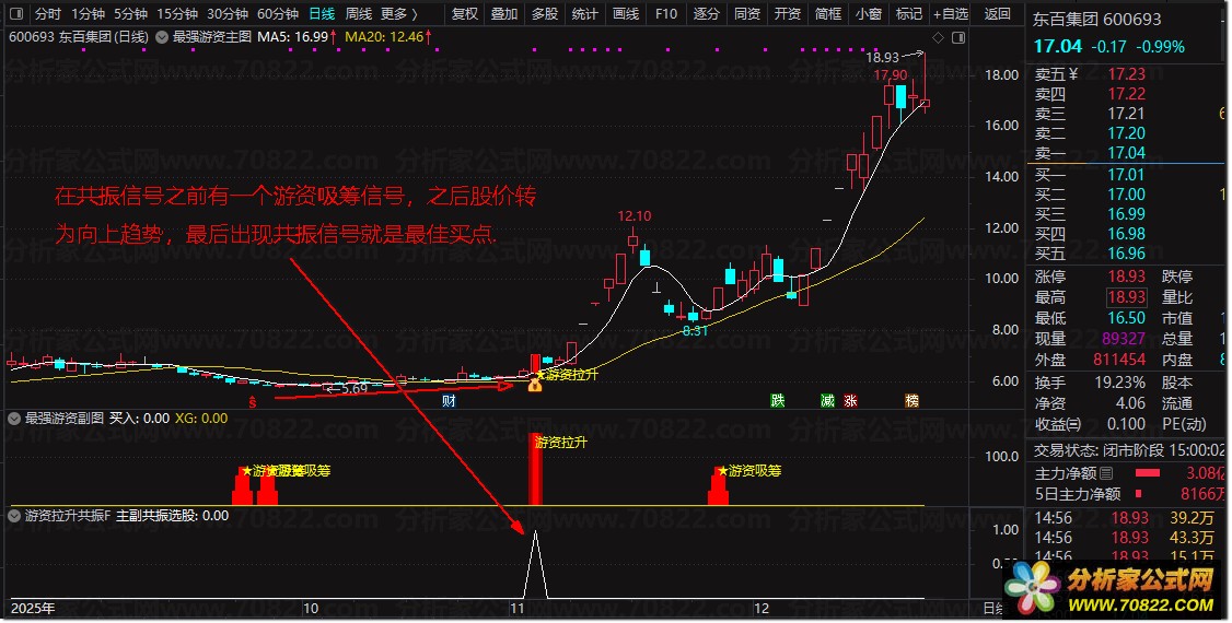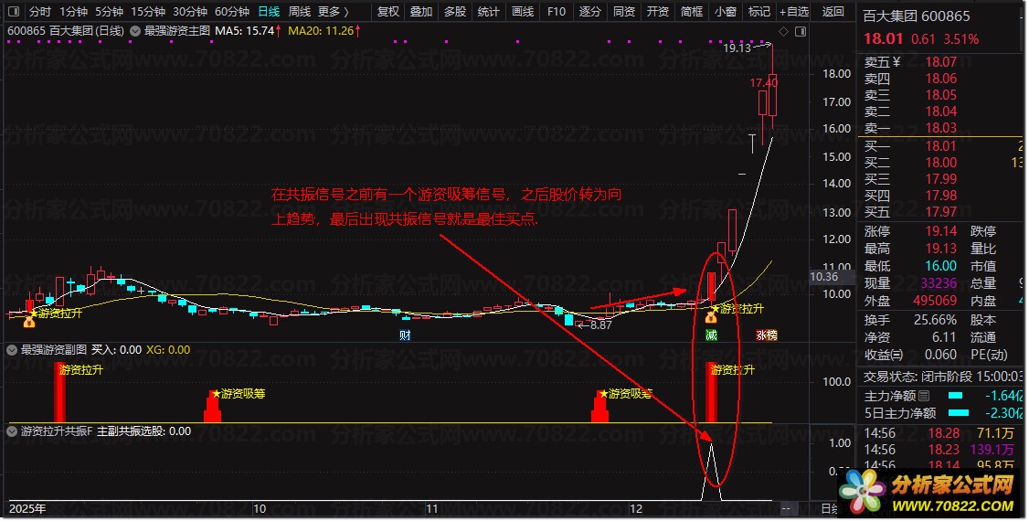 提示:在共振信号之前有一个游资吸筹信号,之后股价转为向上趋势,最后出现共振信号就是最佳买点。