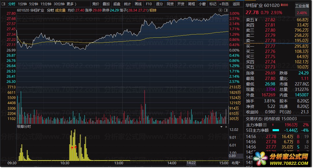 吸筹分时指标为分时副图工具,专注监控主力资金流向,提供指标源码且支持手机电脑通用。该指标信号仅供参考,辅助投资者判断资金动向。