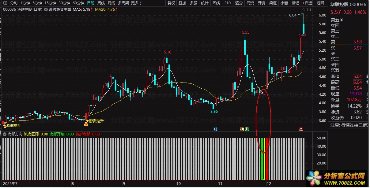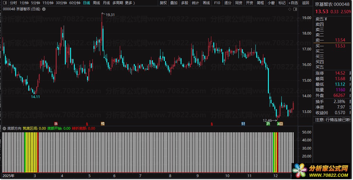 底部方向指标作为抄底圣经级套装工具,完整覆盖底部趋势的三个阶段:筑底启动、筑底持续、底部反转形成。其中,绿色柱代表筑底开始阶段,同时也是精准选股信号的触发点,帮助投资者第一时间捕捉抄底机会;黄色柱持续显示筑底状态,辅助判断底部构筑的稳定性;红色柱则明确标识底部反转形成,预示趋势反转的确定性信号。