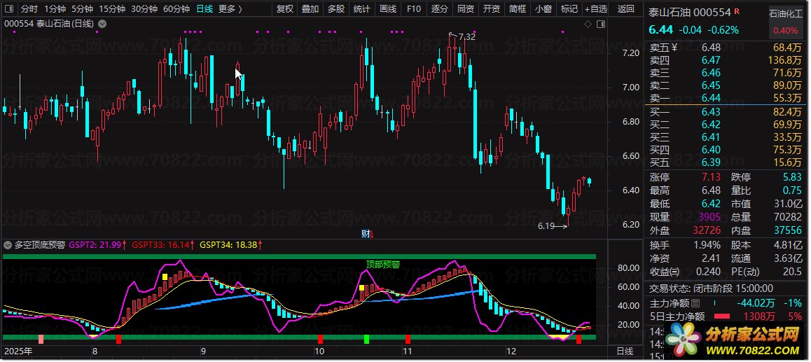底部预警: 当指标下探至极端低位时,副图下方会出现清晰的“底部预警”文字提示,并伴随红色柱线,提示可能的超卖反弹机会。
