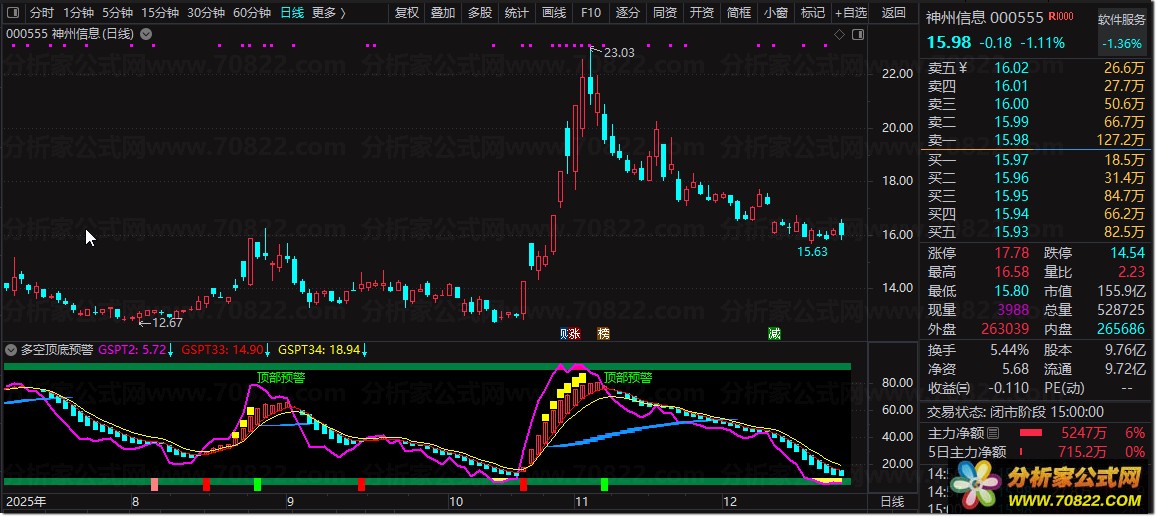 顶部预警: 当动量指标升至极端高位时,副图上方会出现“顶部预警”文字提示,并伴随绿色柱线,警示超买回落风险。