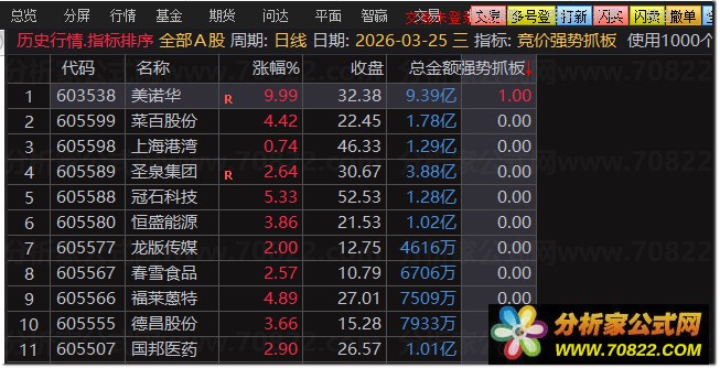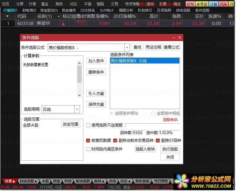 指标需在电脑端使用,交易日9:25后至9:30前,按快捷键 Ctrl+T 选择“竞价强势抓板X”执行竞价选股,结合当前行情择优介入;也可使用幅图指标“竞价强势抓板P”进行排序筛选。手机用户可在选股平台的自编指标中找到对应指标执行操作,根据当日出票数量灵活调整共振参数,优化竞价选股效果。