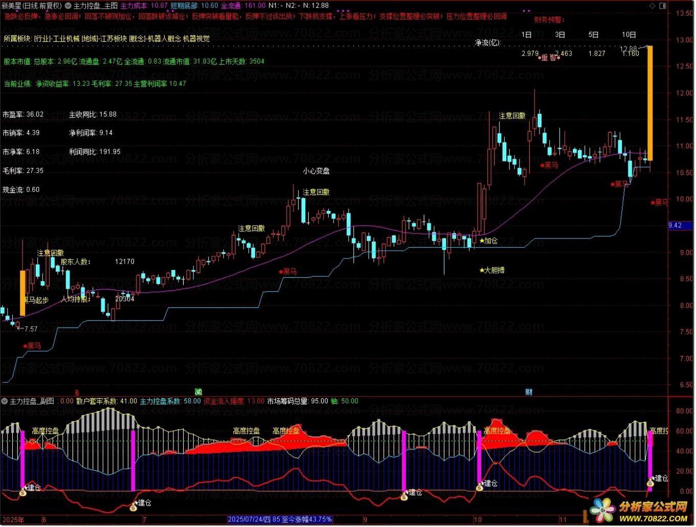 〖主力控盘〗胜率增强指标 十战九赢的量价共振模型 买入时机:主图出现黑马起步或黑马信号,且副图主力控盘系数大于50、资金流入强度为正,叠加财务预警无警,可重仓介入;