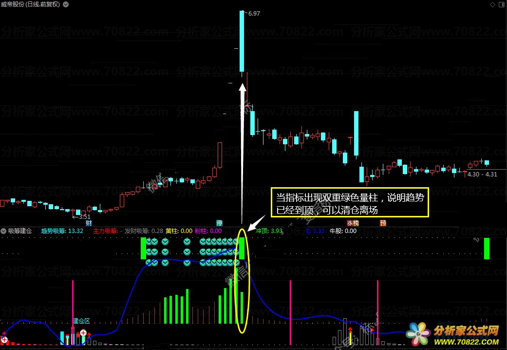 当指标中出现双重绿色量柱时,表明趋势可能见顶,应考虑清仓离场,规避后续风险。