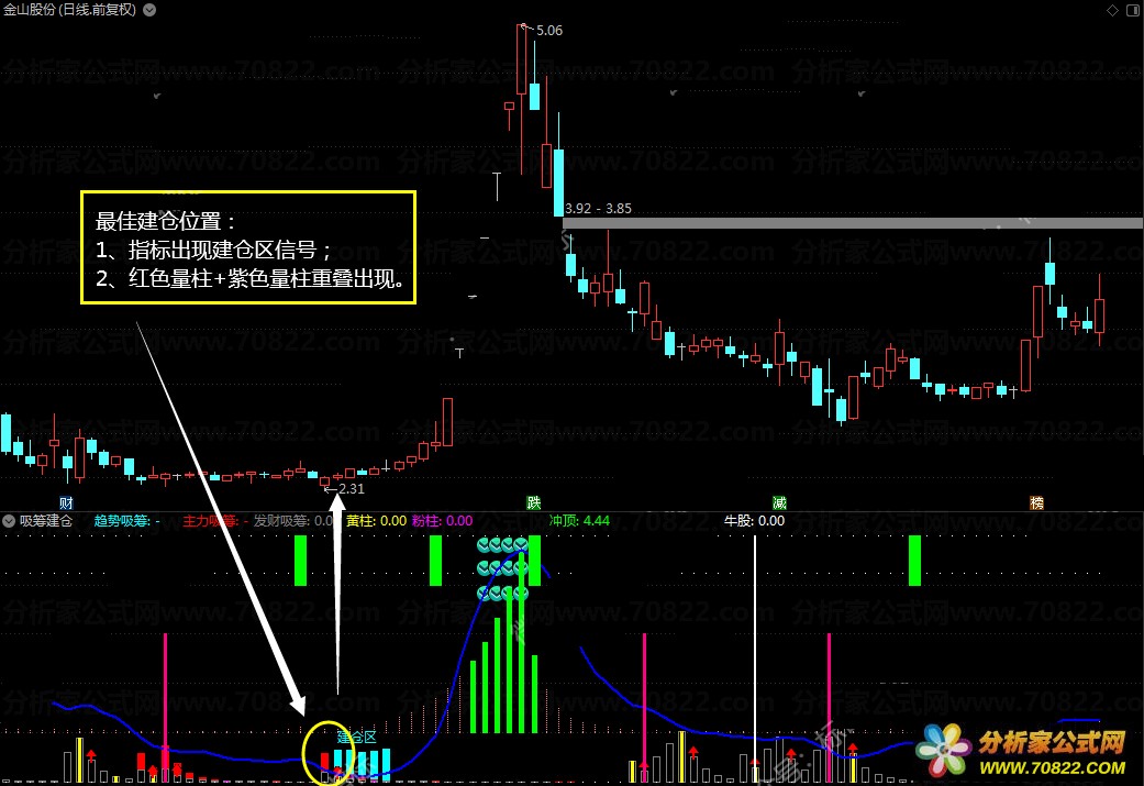 2、若出现红色量柱与紫色量柱重叠,可进一步确认建仓时机。